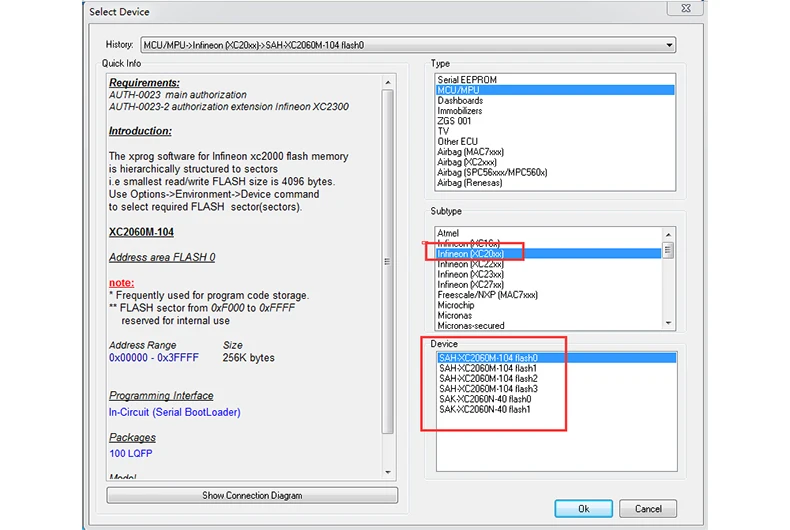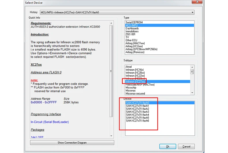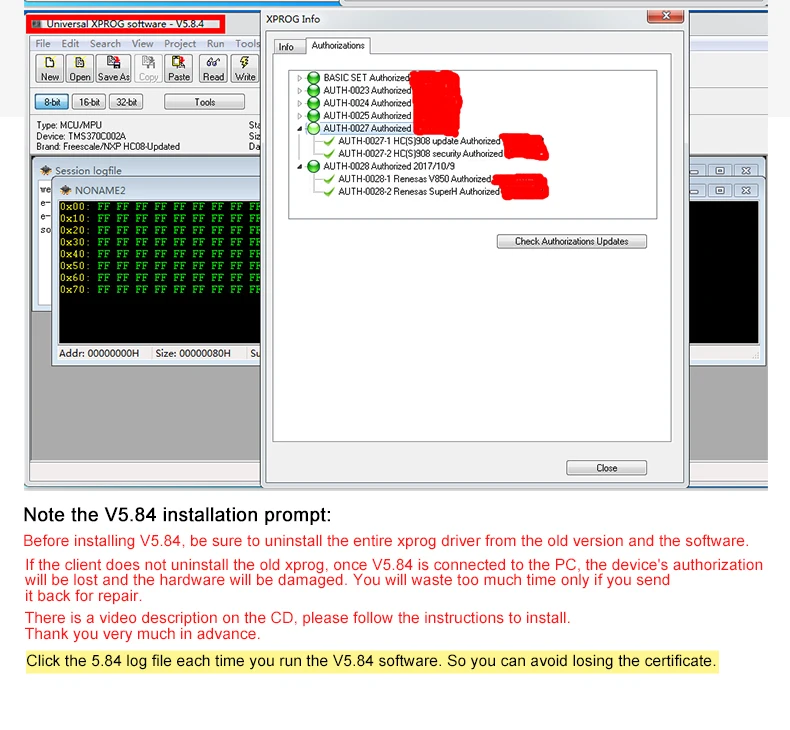 XPROG-M V5.84 Основные характеристики: 1. Последняя версия программного обеспечения: V5.84, прошивка: V4.4 2. С usb-ключом, не нужно активировать 3. Добавить новое разрешение: AUTH-0028-1 авторизованные Renesas V850 и AUTH-0028-2 авторизованные 2017/10/9 Renesas SuperH 4. Язык: английский XPROG-M V5.84 с помощью подсказок: 1. Вам не разрешается использовать этот новейший ключ для обновления старой версии Xprog до V5.84 2. Закройте все компьютерные антивирусные программы. Если нет, программное обеспечение X-prog может быть убито. 3. Отключите Интернет. Если нет, Интернет может повредить оборудование. 4. Удалите все старые версии программного обеспечения xprog-m или xprog box перед установкой V5.84 программного обеспечения, которое мы предоставляем, потому что наше оборудование xprog-box не совместимо с другими более низкими или более высокими версиями программного обеспечения, В противном случае оборудование будет повреждено и потеряет свою гарантию... 5. Никогда не пытайтесь обновить, оборудование будет повреждено, если вы хотите попробовать обновить его онлайн, тогда вы потеряете его гарантию. XPROG-M V5.84 разрешения: AUTH-0001 Motorola HC05 семейное разрешение (позволяет читать/писать EEPROM) AUTH-0002 Motorola HC08 семейное разрешение (позволяет читать/писать EEPROM) AUTH-0003 Motorola HC11 семейное разрешение (позволяет читать/писать EEPROM) AUTH-0004 семейное разрешение Motorola HC12, 9S12 (позволяет читать/писать EEPROM и флэш-память) AUTH-0005 Texas Instruments TMS370/TMS374 семейное разрешение (позволяет читать/писать EEPROM) AUTH-0006 Motorola HC05Bxx и HC05Xxx семейное обозначение безопасности (позволяет считывать/записывать защищенную EEPROM и флэш-память) AUTH-0007 ST M35080 авторизация. Считывание/запись/стирание устройства в состояние доставки. AUTH-0008 BMW EWS3 авторизации AUTH-0009 авторизация семьи ATMEGA (позволяет читать/писать EEPROM и флэш-память) AUTH-0010 MB ZGS001 авторизации AUTH-0011 Motorola HC11EA9/E9 bypass авторизация безопасности (позволяет обойти бит безопасности и считывать память EEPROM и RAM) AUTH-0012 национальное разрешение CR16 (позволяет считывать/записывать память EEPROM) AUTH-0014 ST7, ST10 семейное разрешение (позволяет читать/записывать внутреннюю вспышку) AUTH-0015 авторизация MPC5xx (в зависимости от программы устройства автоматически определяет MPC5xx, M95xxx тип устройства, флэш-память, внешняя вспышка и размер памяти конфигурации) AUTH-0018 Motorola HC12, HC912, MC9S12, MC9S12X обойти разрешения безопасности (позволяет считывать/записывать защищенные EEPROM и флэш-память) AUTH-0020 ARM (микроны, ...) Семейное разрешение (позволяет считывать/записывать внутреннюю вспышку и внешний серийный EEPROM) AUTH-0021 ARM (микроны, ...) Семейное обозначение безопасности (позволяет считывать/записывать защищенную и незащищенную внутреннюю вспышку и внешний серийный EEPROM, просмотр/изменение пробега, номер шасси (VIN), серийный номер и пин-код). AUTH-0023-1 MAC7xxx AUTH-0023-2 XC23xx AUTH-0024-1 MC9S12Cxx AUTH-0024-2 MC9S12XE AUTH-0024-3 9S12XE безопасности AUTH-0024-4 MC9S12HA/HY/P AUTH-0025-1 MPC/SPC5xxx уполномоченный 2016/3/13 AUTH-0027-1 HC(S)908 обновление авторизованного 2016/3/13 AUTH-0027-2 HC(S)908 sercurity авторизованный 2016/3/13 AUTH-0028-1 Renesas V850 уполномоченный 2017/10/9 AUTH-0028-2 авторизованный 2017/10/9 Renesas SuperH XPROG-M V5.84 адаптера: ADP-0001 TMS370 PLCC28 Программирование адаптер ADP-0002 TMS370 PLCC44 Программирование адаптер ADP-0003 TMS370 PLCC68 Программирование адаптер ADP-0004 Motorola HC05B/X PLCC52 программирующий адаптер ADP-0005 Motorola HC05B/X QFP64 программирующий адаптер ADP-0006 ST M35080 in-circuit программирующий адаптер ADP-0008 TMS374 семейный сетевой адаптер для программирования ADP-0009 MC68HC05V12 Программирование адаптер ADP-0010 TMS374 бортовой Адапт
