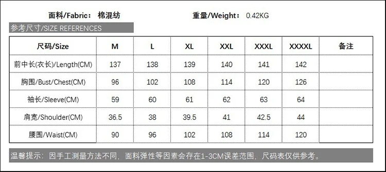 M: Длина 137 см, обхват груди 96 см, длина рукава 59 см, ширина плеч 36,5 см, обхват талии 90 см L: длина 138 см, обхват груди 102 см, рукав 60 см, ширина плеч 38 см, обхват талии 96 см XL: длина 139 см, обхват груди 108 см, рукав 61 см, ширина плеч 39,5 см, обхват талии 102 см 2XL: Длина 140 см, обхват груди 114 см, рукав 62 см, ширина плеч 41 см, обхват талии 108 см 3XL: Длина 141 см, обхват груди 120 см, рукав 63 см, ширина плеч 42,5 см, обхват талии 114 см 4XL: длина 142 см, обхват груди 126 см, Рукав 64 см, ширина плеч 44 см, обхват талии 120 см