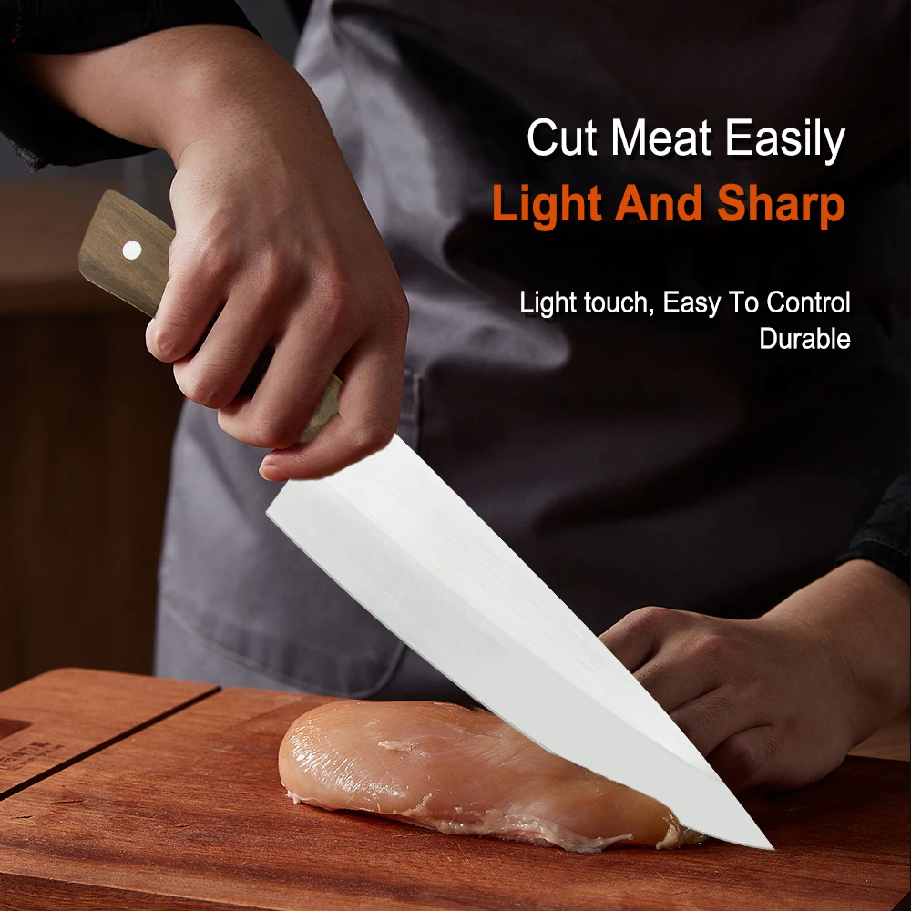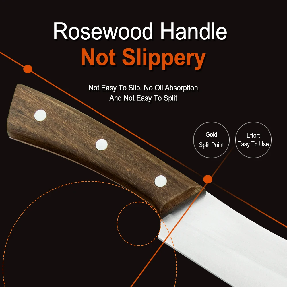 Этот нож шеф-повара изготовлен из нержавеющей стали, ручка и лезвие интегрированы без пайки, который является прочным и прочным для устранения сломанной ручки