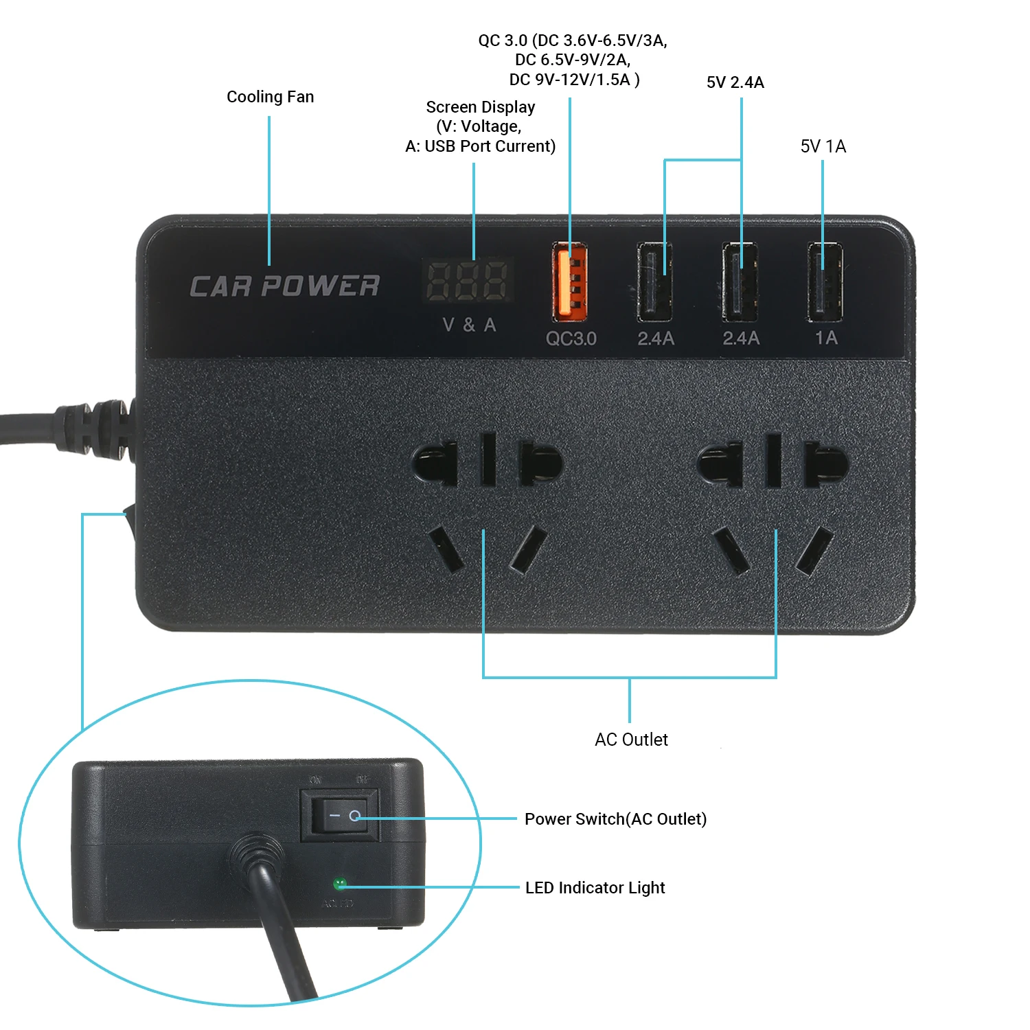 Инвертор мощностью 150 Вт способен преобразовывать 12 В постоянного тока в 220 В переменного тока. И он имеет два выхода переменного тока и четыре usb-порта, имеет практичные, полезные и прочные характеристики.