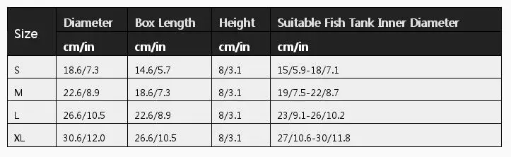 Size Diameter Box Length Height Suitable Fish Tank Inner Diameter