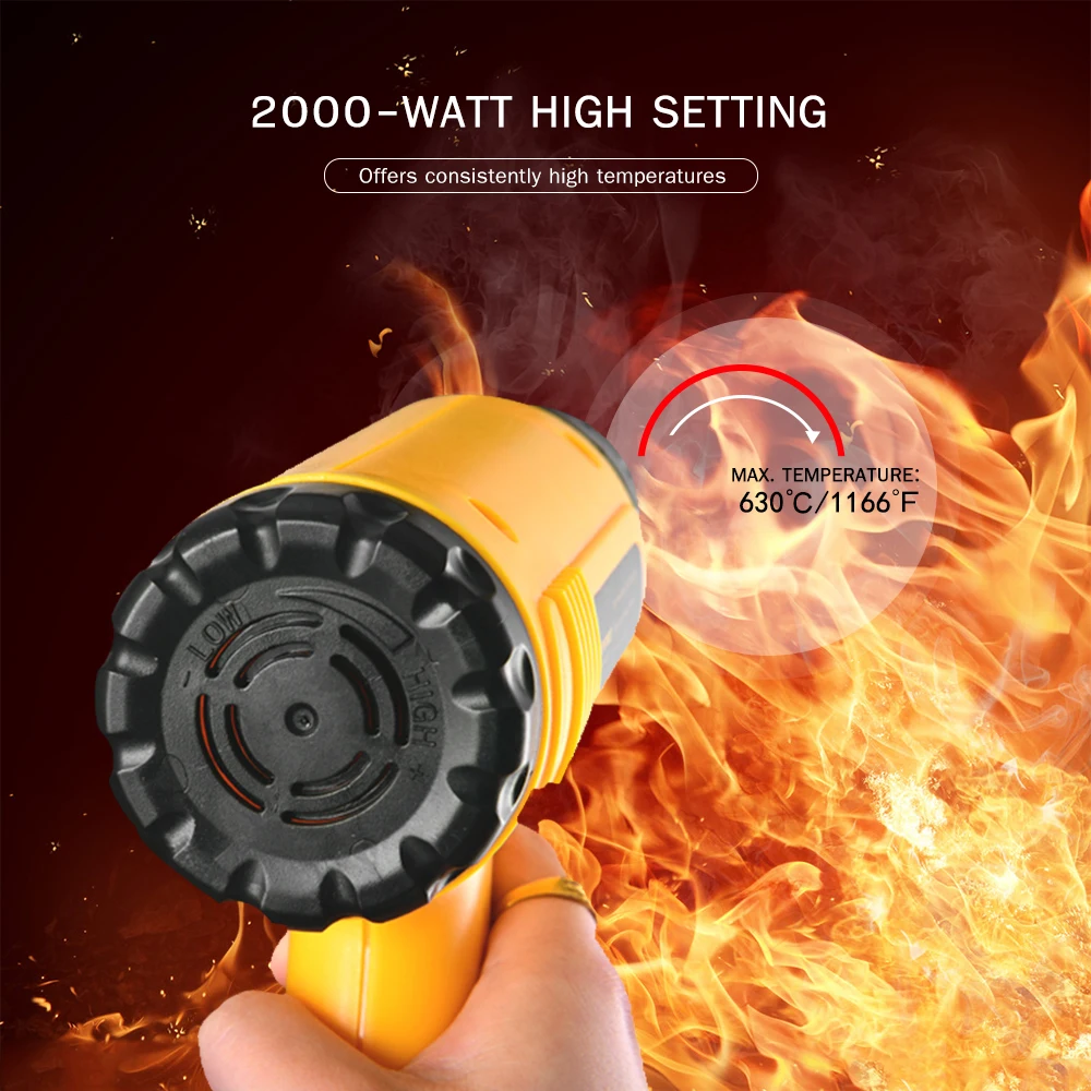 Тепловая пушка с высокой температурой 2000 Вт генерирует огромное тепло и достаточный поток воздуха и обеспечивает стабильные высокие температуры и достойный контроль для детальной работы.