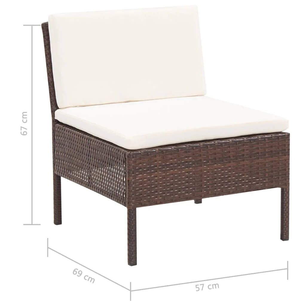 Цвет подушек: кремово-белый Материал: тканая смола (полиэтилен), стальная рама с порошковым покрытием Материал подушки: 100% полиэстер с хлопковым наполнителем Размеры журнального столика: 60x60x35 см (Д x Ш x В) Размеры углового дивана: 69x69x67 см (Ш x Г x В) Ширина сиденья: 57 см Глубина сиденья: 57 см Высота сиденья: 35 см Размеры центрального дивана: 57x69x67 см (Ш x Г x В) Ширина сиденья: 57 см Глубина сиденья: 57 см Высота сиденья: 35 см Требуется сборка В комплект поставки входит: 2 х угловой диван 3 x центральный диван 1 x журнальный столик 7 x задняя подушка 5 x подушка сиденья