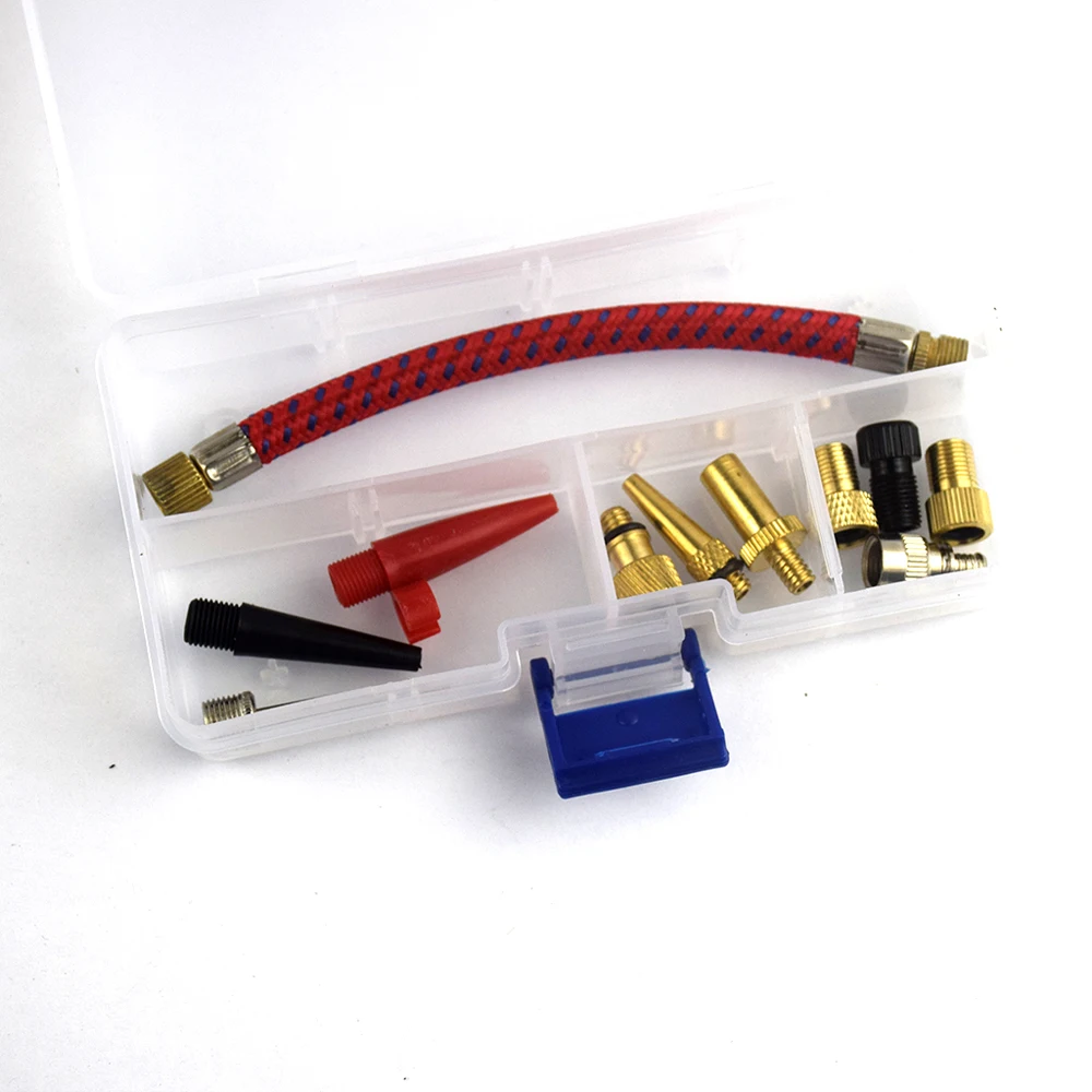 Это набор качественных велосипедных адаптеров, включает в себя 1 металлическую шариковую иглу, 1 надувной шланг, 2 пластмассовых воздушных насадок и 7 различных видов разъемов, вы можете использовать его для надувания многих вещей. Эластичный и гибкий Удлинительный шланг, вы можете легко сгибать его под любым углом. Хорошая прочность и устойчивость к поломке, n-eedle не будет легко деформировать шланг не легко сломать. Несколько целей, легко установить велосипедные шины, футбол, мяч для корзины и шар и тому подобное. Вы можете попробовать.