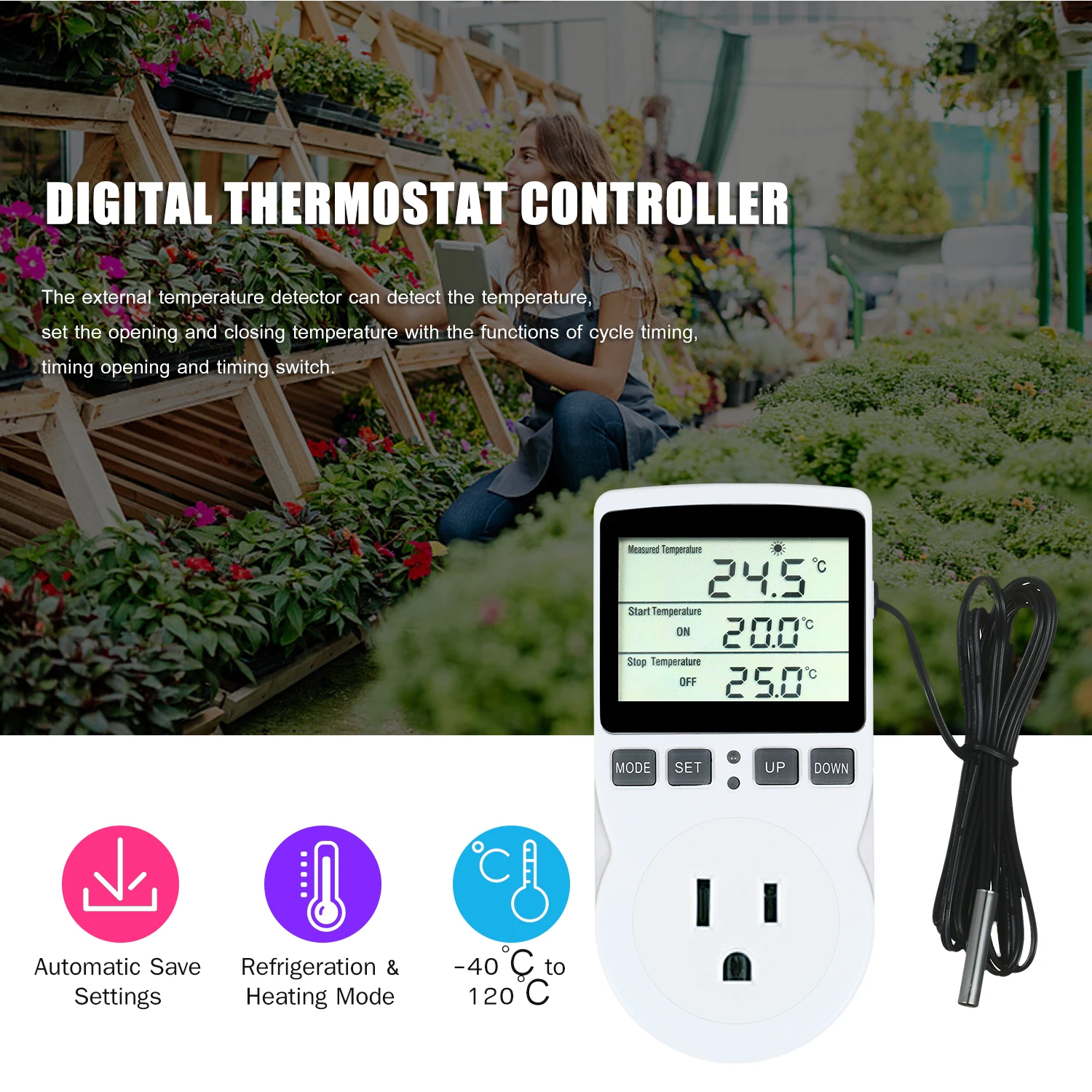 Широко используется для интеллектуального контроля температуры террариума, аквариума, резервуара для змеи, аквакультуры, теплицы, прорастания семян, кондиционера, холодильника, инкубатора, тепловой лампы/прокладки, подогрева углеродных кристаллов и т. д.
