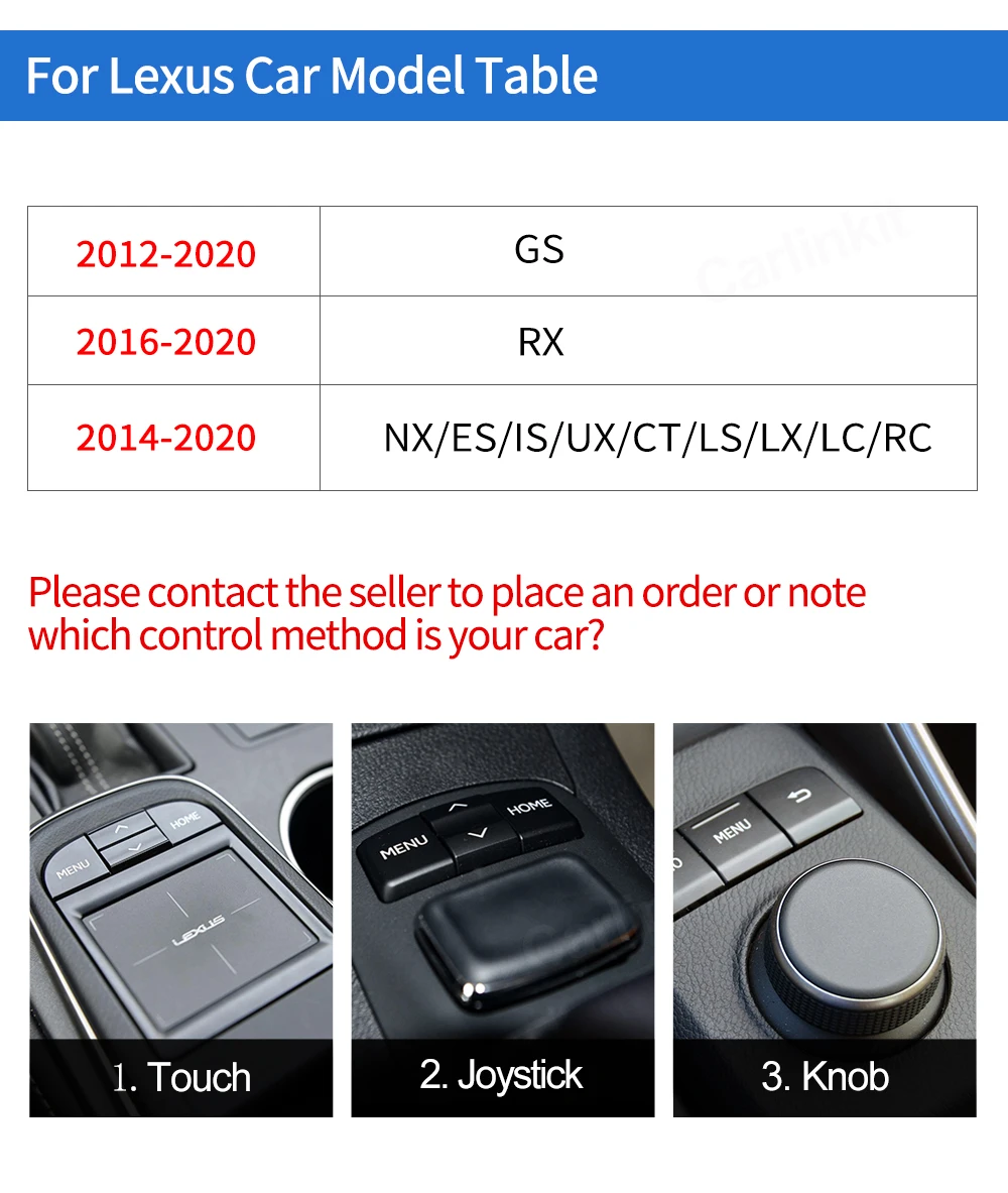 1) перед покупкой, пожалуйста, отправьте фото центральной консоли автомобиля продавцу для подтверждения и сообщите продавцу модель Lexus и возраст. 2) Если у вас есть какие-либо вопросы о продукте, пожалуйста, используйте WhatsApp, чтобы связаться с продавцом Carlinkit. 3) все продукты поддерживают только бесплатную обратную доставку без беспокойства, и DHL не поддерживает бесплатную доставку. Этот продукт отправляется DHL, поэтому Бесплатные возвраты не поддерживаются. Чтобы избежать возврата, пожалуйста, проконсультируйтесь с продавцом перед покупкой.