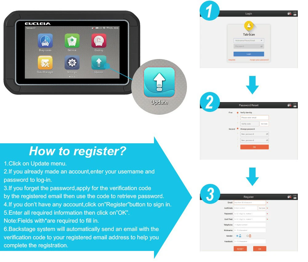 Как зарегистрируйте учетную запись? 1. Выберите приложение "TabScan»-«Обновить», получите регистр меню. 2. Вход все персональные данные и полный реестр, вы можете использовать ID и пароль для входа в