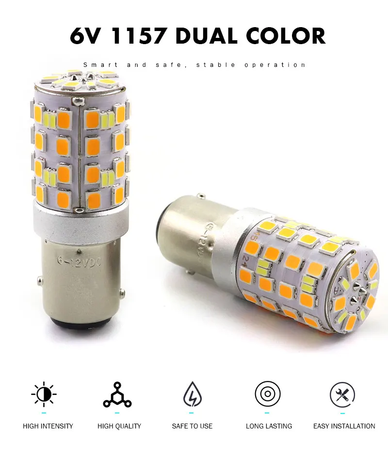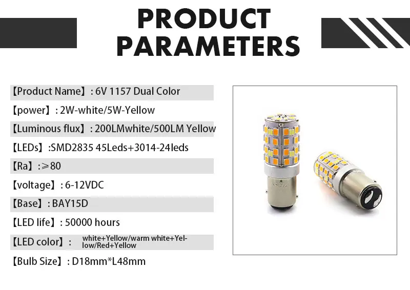 【Название продукта: 6 В 1157 двойной цвет 【Power】: 2w-белый/5w-желтый 【Световой поток: 200 лмбелый/500 лм желтый 【LEDs】:SMD2835 45 светодиодов + 3014-24 светодиодов 【Ra】:≥ 80 【Напряжение: 6-12 В постоянного тока 【Основание: BAY15D 【Светодиодный срок службы: 50000 часов 【Цвет светодиодов: белый + желтый/теплый белый + желтый/красный + желтый 【Размер лампы 】: d18 мм * l48 мм