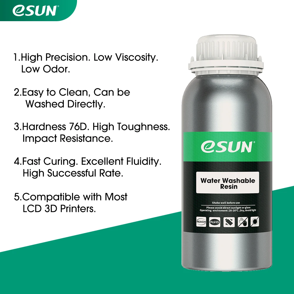 【Высокая точность и низкая усадка 】esun водная моющаяся Резина содержит акрилатные мономеры, чтобы уменьшить усадку объема во время процесса фототерапии, что обеспечивает высокую точность модели печати с гладкой отделкой.