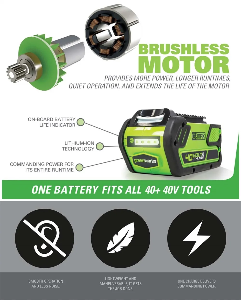 Стиль:40V 4Ah аккумулятор и зарядное устройствоБудь то скашивание вашего двора или обрезка изгороди, сорняков и конечностей или сдувание мусора; инструменты GreenWorks предлагают комплексное решение для садовых работ, которое позволит сделать вашу работу для профессионального ландшафтного образа с помощью экотопливных систем. От 20 В, 24 В до 40 В литий-ионные аккумуляторные платформы теперь вы можете найти лучшую систему для газона и сада, которая будет соответствовать вашим потребностям по стоимости (цене), мощности и универсальности. Серия DigiPro seamless G-MAX обеспечивает газосопоставимую мощность без газа. В настоящее время с 16-дюймовой бензопилой DigiPro, воздуходувкой DigiPro 185 миль/час и 14-дюймовым триммером на струнах вам не нужно жертвовать энергией, чтобы переключиться без сети. Бесщеточный триммер DigiPro обеспечивает 14-дюймовый рез с насадкой (головкой) С. 080 для облегчения продвижения лески и резки жестких сорняков. Прямая конструкция вала позволяет легко просматривать Ваши задачи, не препятствуя обзору, что позволяет легко работать во дворе. Для универсальности, головка двигателя с верхним креплением съемная для обеспечения нескольких возможностей использования и совместима с большинством насадок для газа, так что вам не придется покупать новые фирменные инструменты (дополнительные модели совместимости см. В описании выше). При поиске правильного газа, сопоставимого с инструменты для лужайки, GreenWorks G-MAX System-это правильное решение, к которому можно обратиться с мощностью и производительностью, более длительным временем работы и универсальностью, чтобы выполнить работу.