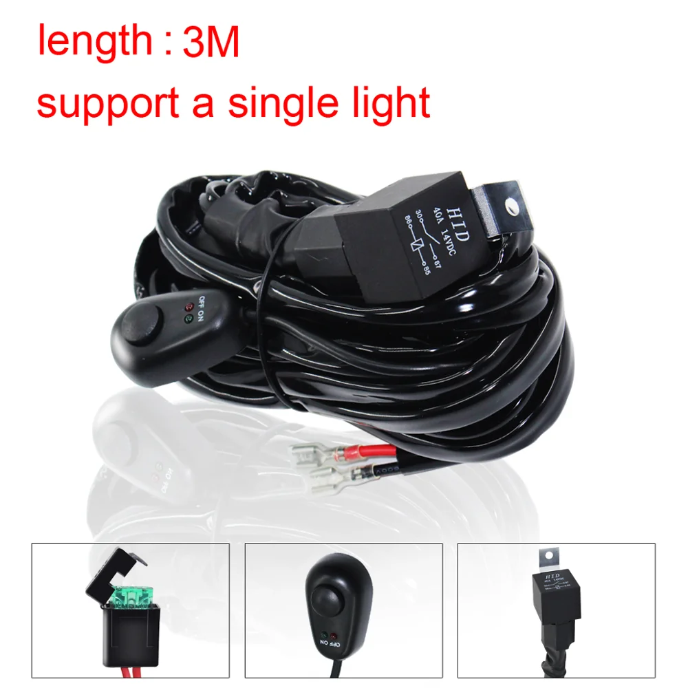 Мощность: максимальная поддержка одного рабочего светильник 300 Вт и ниже. Входной источник питания: 9-16 В (если аккумулятор вашего автомобиля-грузовик или другие модели-24 В, просто измените реле на 24 В). Ядро: 14AWG (2 квадратных) Срок службы светильника: 6000H Цветовая температура: 6000K Вес: 0,439 кг Описание товара: 1. Основной соединитель проводки 6,3 с обшитым кольцом. 2. Общая длина линии управления переключателем составляет 3 метра (переключатель поставляется с 1 метром, жгут проводов-2 метра), а длина реле на рабочий светильник-3 метра. Длина реле на батарею составляет 0,5 метра. 3. С реле и предохранителем высокого тока, безопасность гарантируется. 4. Клавишный переключатель (с клеем) может быть установлен в любой части, простой и удобный. 5. Непосредственно Подключите аккумулятор, чтобы получить электричество, чтобы убедиться, что линия электропитания оригинального автомобиля не повреждена.