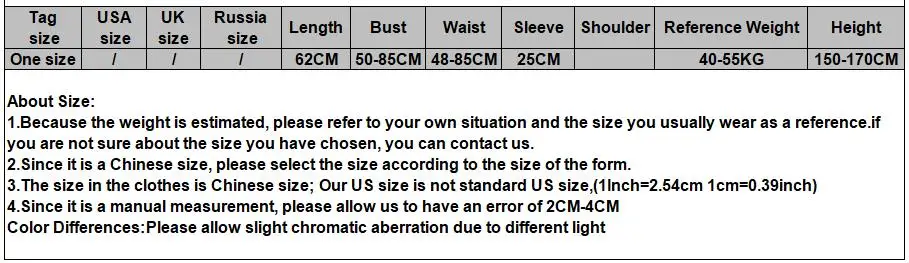 3. Все измерения указаны в см (1 см = 0,39 дюймов). Возможна разница в 2-3 см в соответствии с измерениями вручную. Пожалуйста, внимательно проверьте таблицу размеров перед покупкой товара.