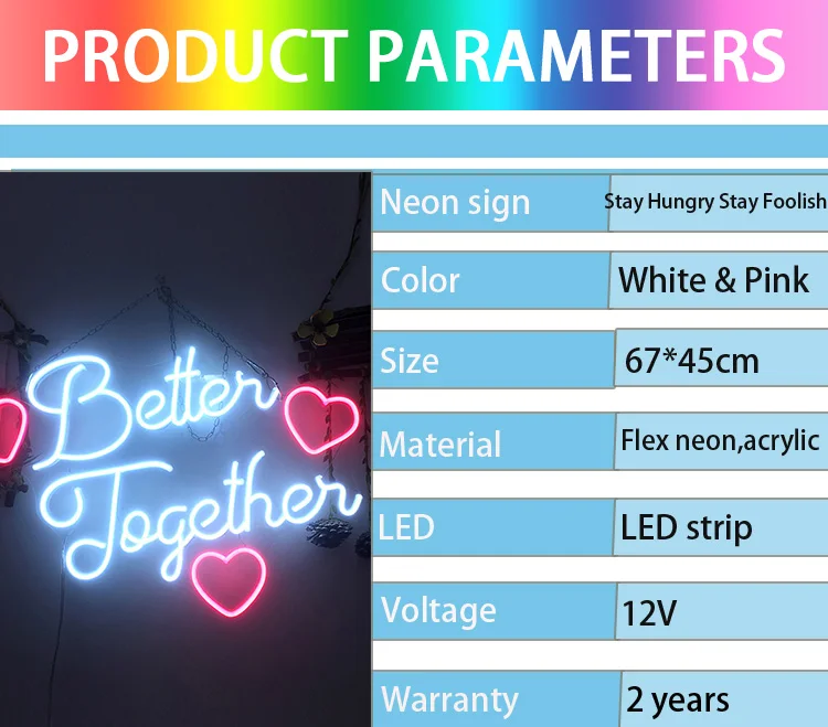 100% новый и высокое качество Неоновая вывеска: лучше вместе Цвет: белый и розовый Материал: Гибкий неоновый, акриловый Светодиодный: светодиодный Напряжение: 12 В Гарантия: 1 год Можно выбрать цвет по индивидуальному заказу