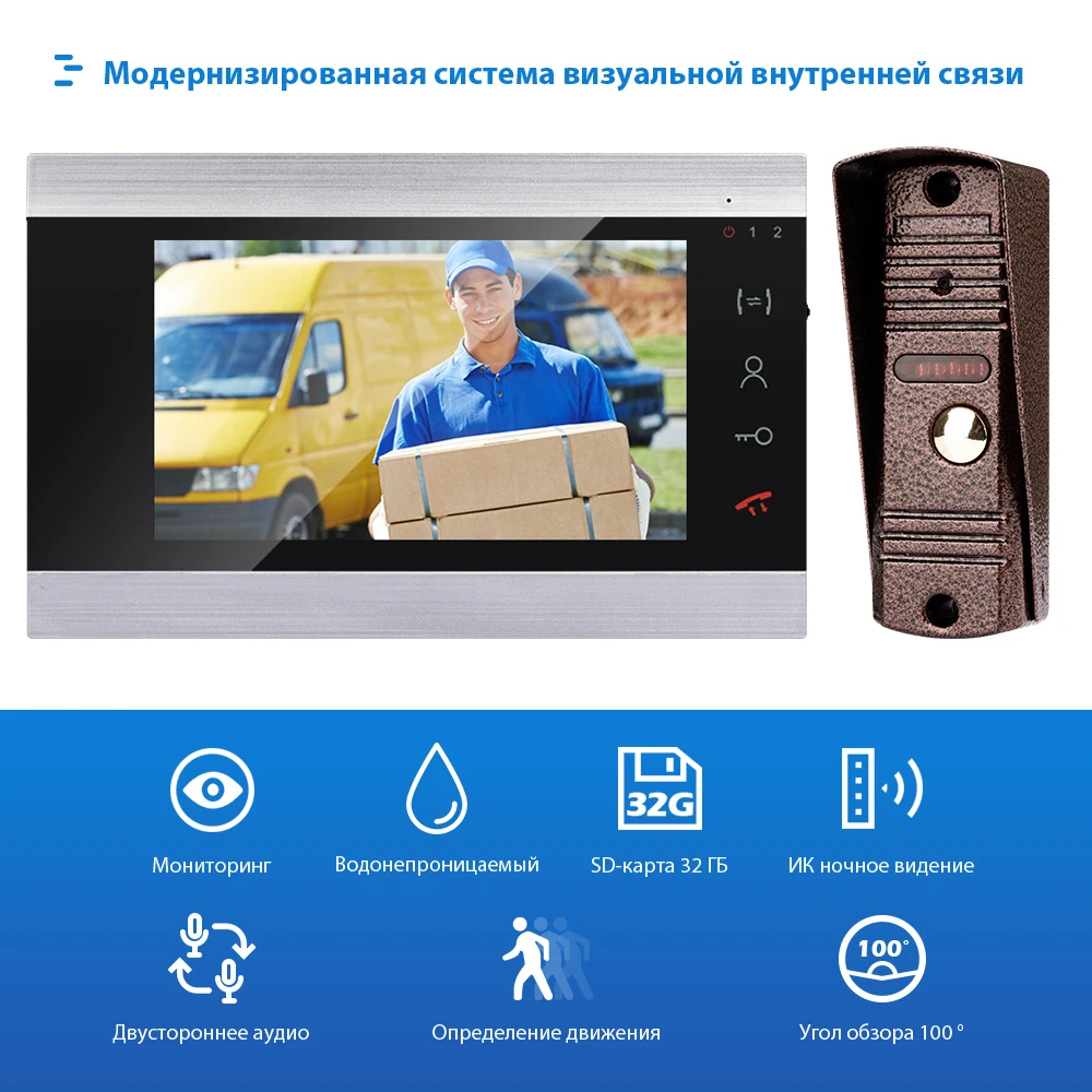 🌼Поддержка карты памяти max.32GB 🌼Монитор встроен в детектор движения 🌼Дверной звонок 1000TVL и угол обзора 100 ° 🌼Поддержка фоторамки, часов и голосовых сообщений 🌼7 дюймов TFT дисплей, пластиковый чехол и ручная кнопка 🌼Поддержка отключения времени блокировки, подходит для различных электронных замков (не входит в комплект) 🌼Поддержка записи и воспроизведения, MP3 и MP4 плеер, поддержка выбора музыки с карты памяти в качестве мелодии звонка