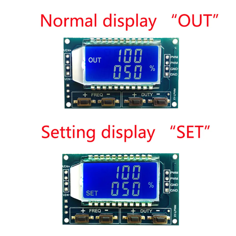 Модуль имеет четыре независимых клавиши, используемые для настройки частоты и рабочего цикла, поддержка касания (увеличение или уменьшение блока) и длительное нажатие (быстрое увеличение или уменьшение), установка параметров автоматически сохраняет, выключение питания не теряется.