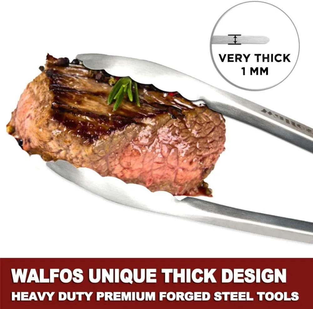 4.Пищевой материал-Металлические щипцы для барбекю WALFOS изготовлены из 100% пищевой нержавеющей стали, одобрены FDA, нетоксичные, без Chenmical покрытия. Безопасно прикасаться к пище напрямую, хорошо для здоровья.