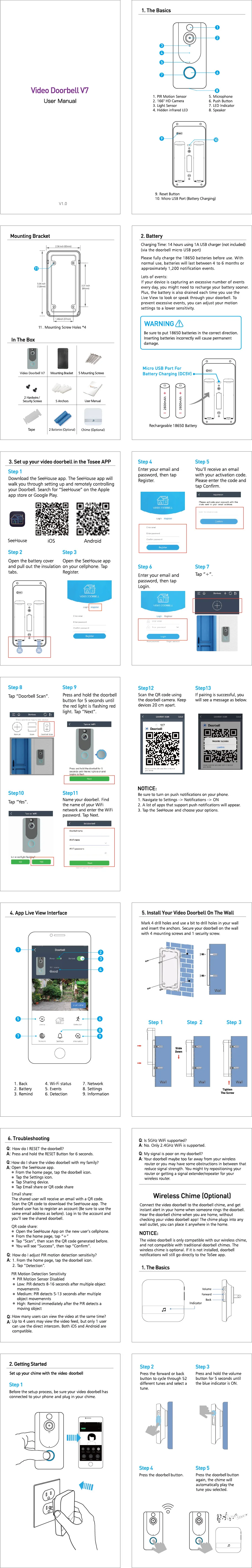 -Видео дверной звонок будет передавать мгновенные уведомления на ваш мобильный телефон, когда посетители нажимают ваш дверной звонок или запускают Встроенные датчики движения, работают для Android / iOS.