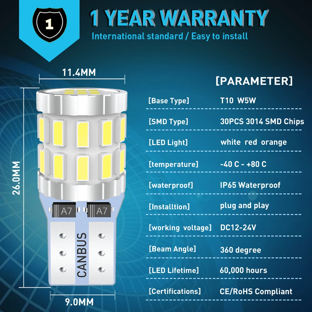 Состояние на 100% абсолютно новый Тип разъема: Стандартный T10 (W5W) Цвет: белый Тип СВЕТОДИОДА: 3014 SMD Количество светодиодов: 30 светодиодов/лампочек Напряжение: 12 В Мощность: 3 Вт/лампа Угол луча: 360 градусов Срок службы: 50 000 часов