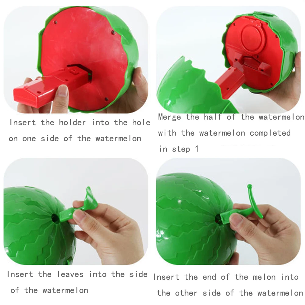 Взрывная вода арбуз раздавить игрушки 1. Вставьте держатель в отверстие с одной стороны арбуза 2. Соедините половину арбуза с арбузом, завершенным в Шаге 1 3. Вставьте листья в сторону арбуза 4. Вставьте конец дыни в другую сторону арбуза 5. Согласно отметке арбуза на наклейке в середине арбуза 6. Накройте семена и воду крышкой 7. Снимите крышку с арбуза и поместите семена в раковину 8. Заполните инжектор адекватной водой и закройте крышку Поверните указатель набора номера в точку 1, удерживайте арбуз поверх головы и нажмите его один раз и так далее, пока он не взорвется