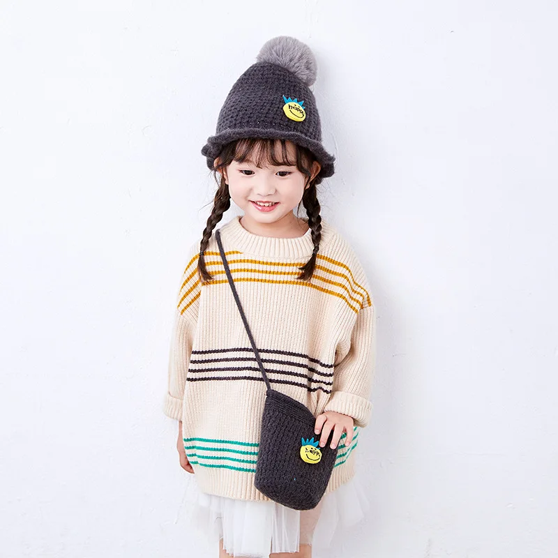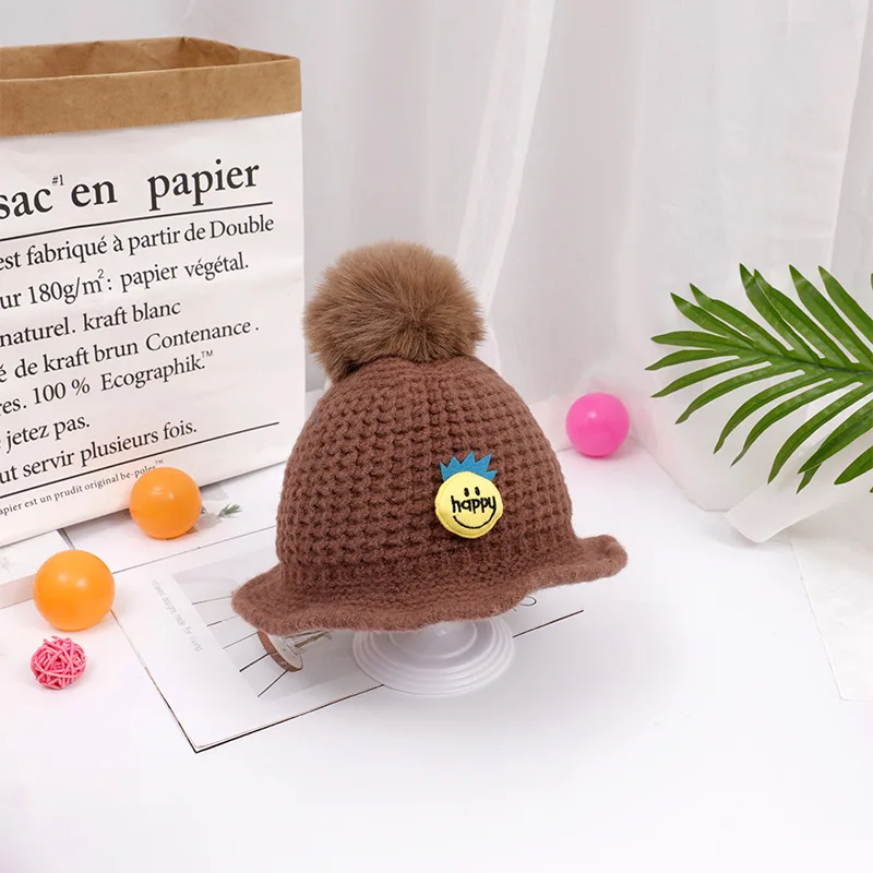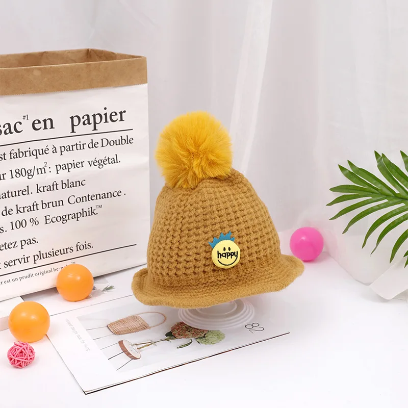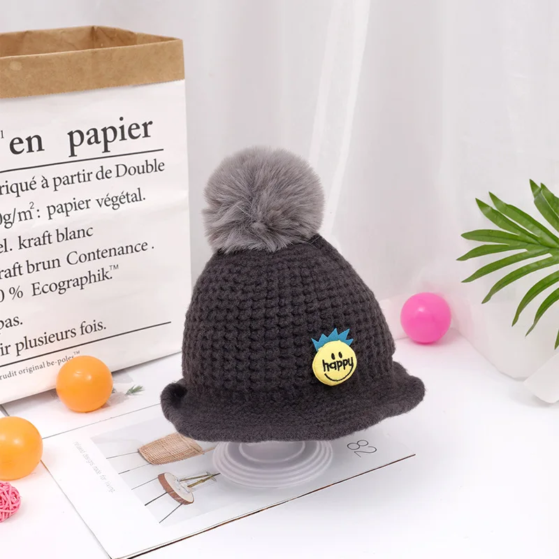 Детская Милая вязаная шапка; Новинка; Детская шерстяная шапка для девочек в Корейском стиле; Милый меховой шарик со смайликом; Шапка в рыбацком стиле для малышей
