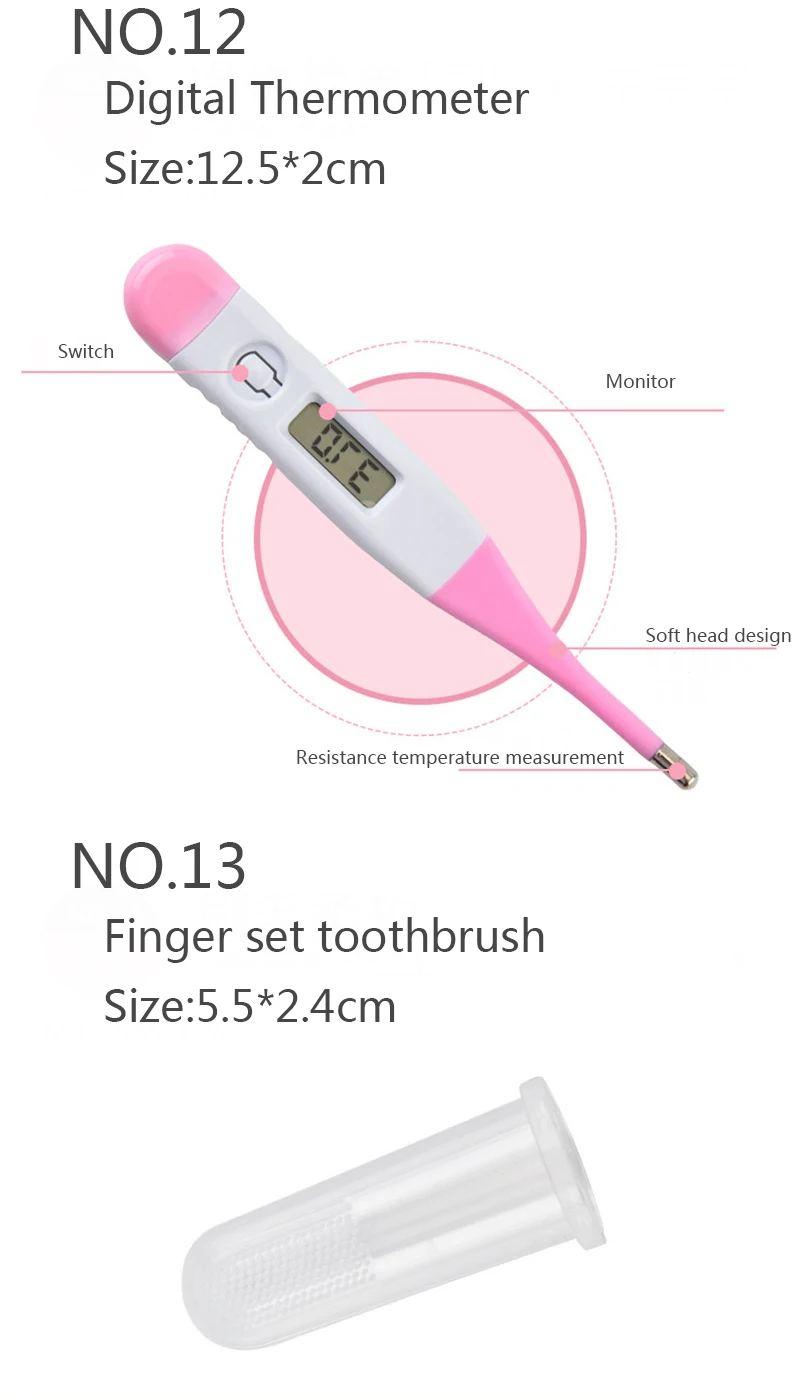 Описание: Новинка и высокое качество! Цвет: синий, розовый Материал: силикон + пластик + нержавеющая сталь Особенности: Специально разработан для новорожденных, высокое качество Безопасный и идеально подходит для новорожденных детей удобный, компактный и легкий. Этот комплект 13cs содержит самые необходимые вещи, которые вам нужно, чтобы ваш ребенок был хорошо Термометр, точное считывание температуры. Медицинский шприц и медицинская ложка помогают родителям измерять и вводить правильную дозировку. Мягкие Детские кисти. Защитите кусачки, защищая кожу вашего ребенка от порезов