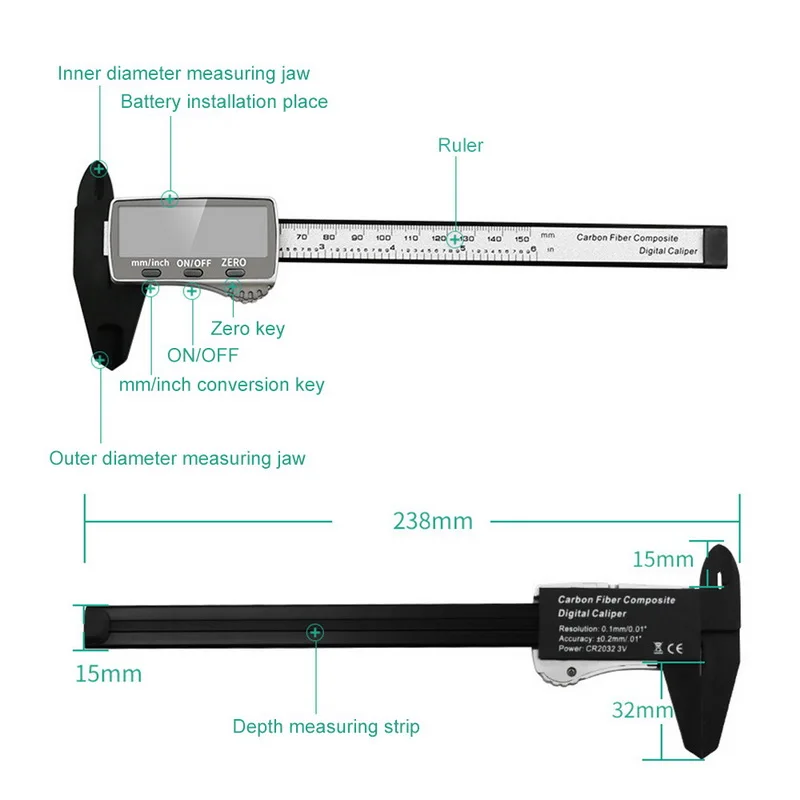 <Высокая точность: Диапазон измерения: 0 - 6 ”и 0 - 150 мм; Разрешение: 0,1 мм; И точность: ± 0,2 мм