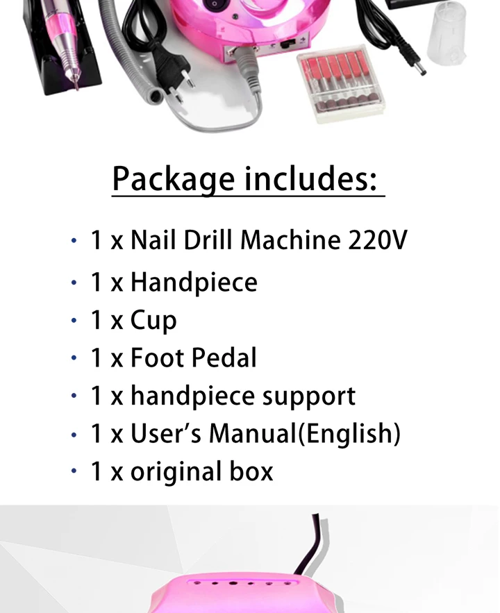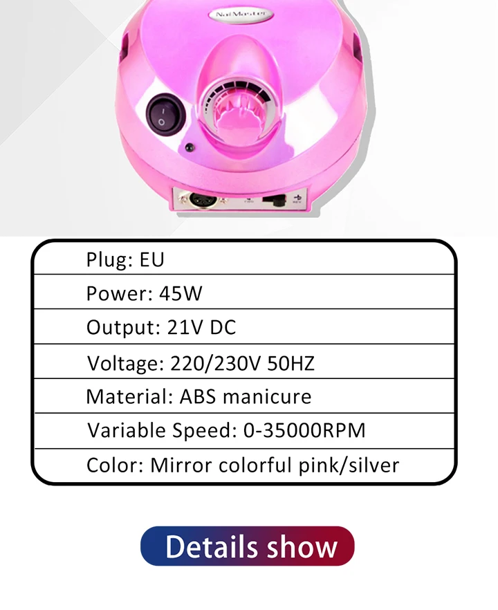 Напряжение: 220 В дрель для ногтей Скорость: 35000 об/мин 2 цвета на выбор: розовый/серебристый Характеристики: высокая скорость, низкий уровень шума; Регулируемая скорость; (6 типов сменных шлифовальных головок) Сменная Шлифовальная головка; Удаление брони, полировка, заточка, гравировка, сверление. В основном используется для удаления брони/полировки/заточки/ Гравировка/сверление.