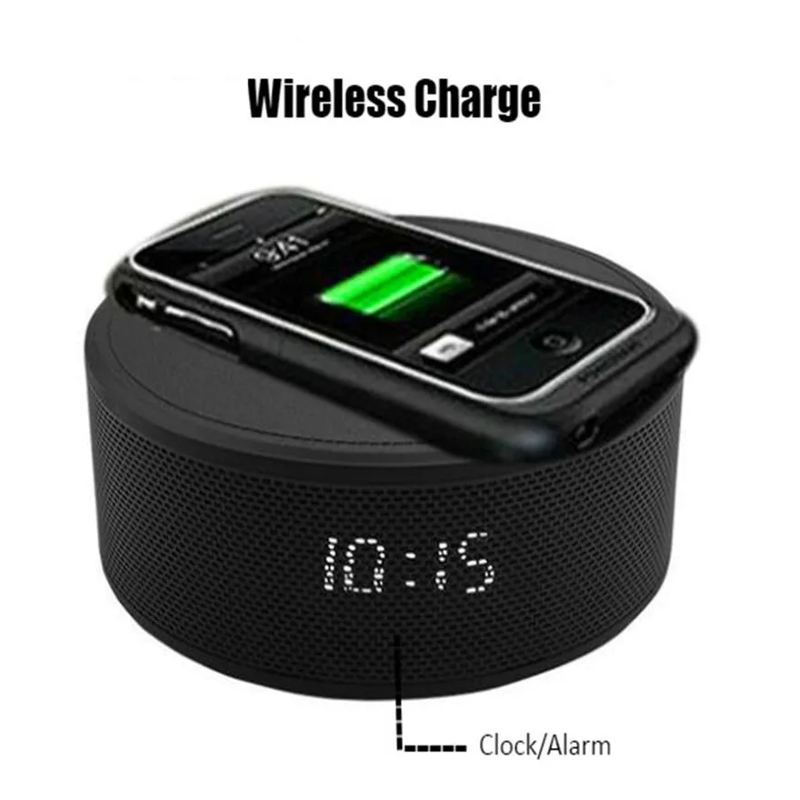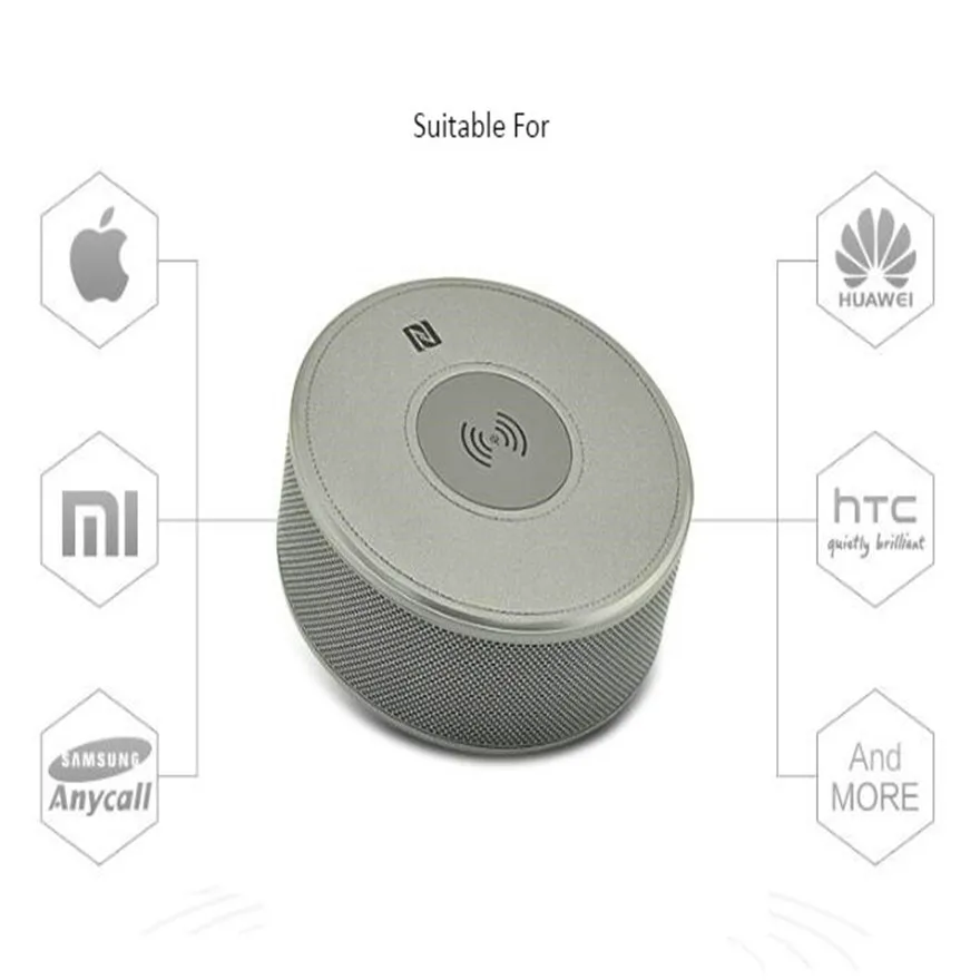 1. RMS: 2x3 Вт, поддержка bluetooth/handsfree call/TF/AUX/NFC, светодиодный Дисплей для отображения часов/будильника 2. Встроенный аккумулятор 2000 мАч, 6 часов работы, Беспроводная зарядка 3. Размер: 14,9 (dia)x4.9 см, вес: 432 г 4. Цвет: Золотой/черный/серебристый/серый