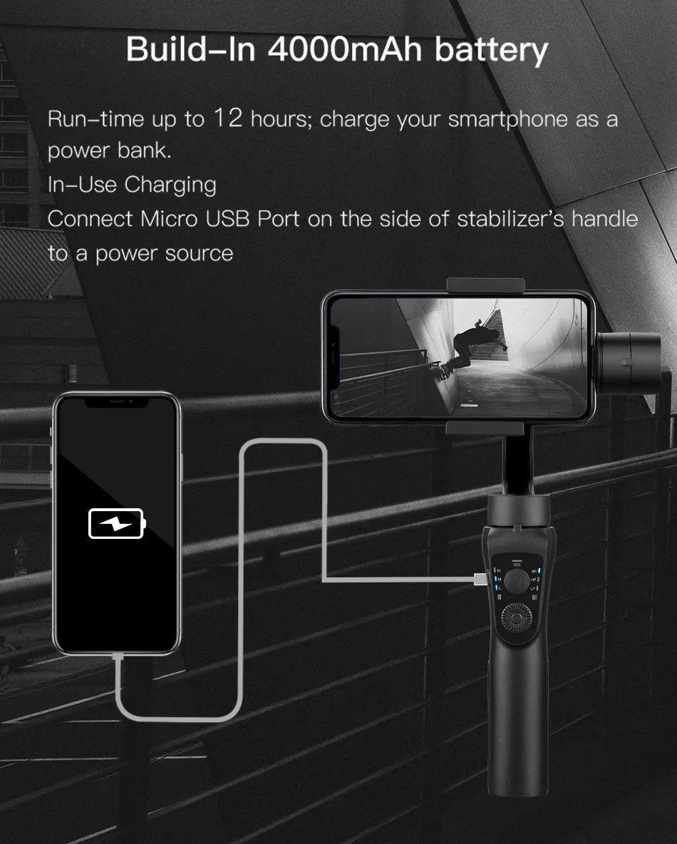 Длительность до 12 часов; Заряжайте ваш смартфон как внешний аккумулятор. Зарядка в использовании Подключите порт Micro USB на стороне ручки стабилизатора к источнику питания