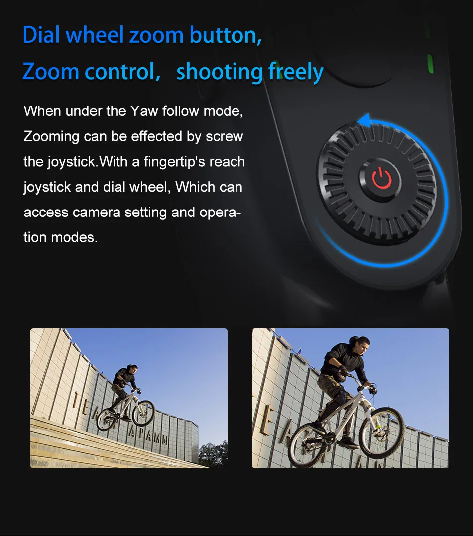 Находясь в режиме отслеживания Yaw, масштабирование может быть выполнено одним винтом на джойстике. С джойстиком с кончиком пальца и колесом циферблата вы можете получить доступ к настройкам камеры и режимам работы.