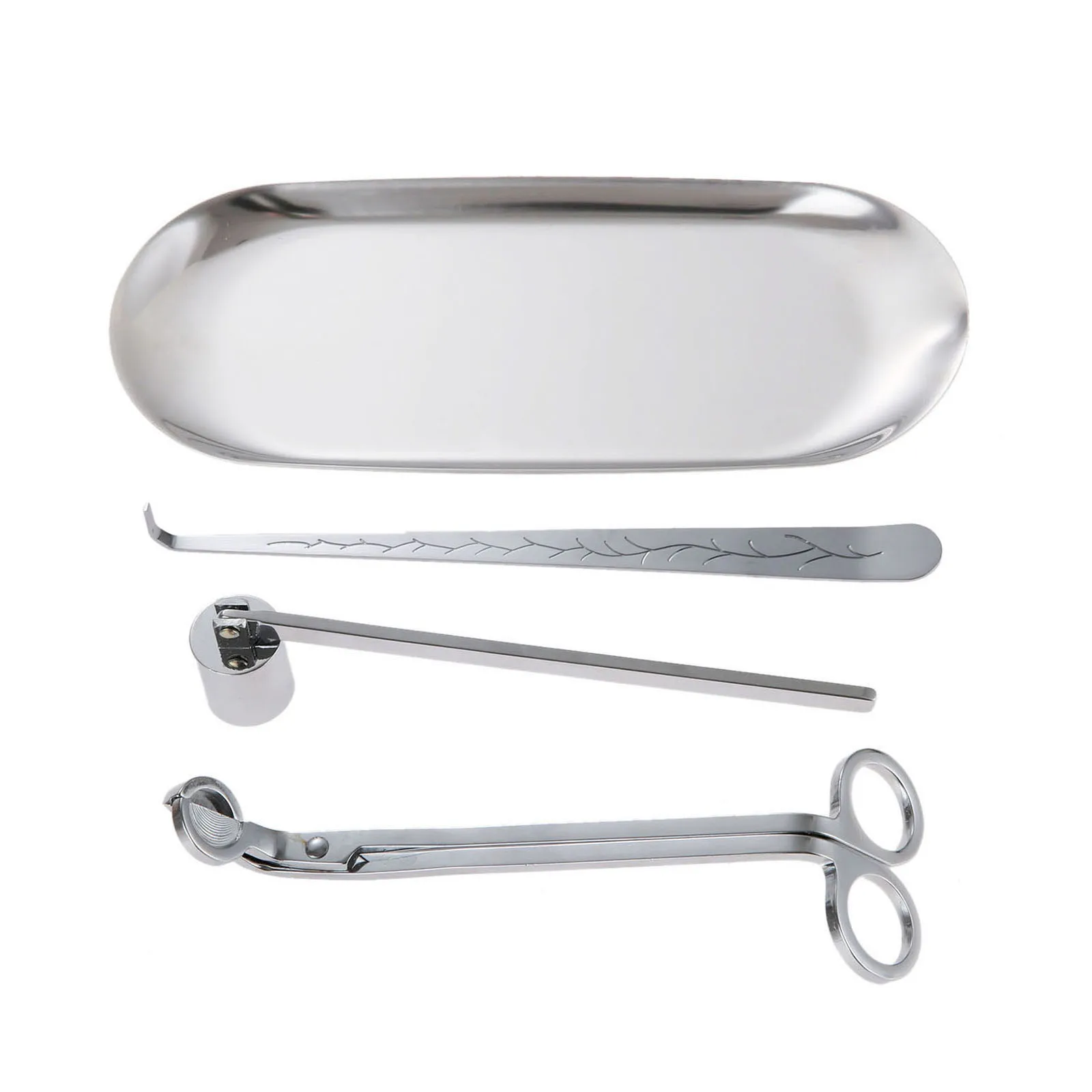 100% brand new. Stainless steel material made, durable and wear resistant. Help you to extinguish candle in a quick way. Noble appearance with fine workmanship, great for home decor. Widely used for dining table, kitchen, bathroom vanity, countertop and other places. Material: Stainless steel Snuffer: Approx. 19*2.3cm/7.5*0.9in Trimmer: Approx. 180*57mm/7.09*2.24inch Hook: Approx. 20cm/7.87inch Tray: Approx. 23*9.5cm/9.06*3.74inch Color: Gold/Black/Rose Gold/Silver Note: