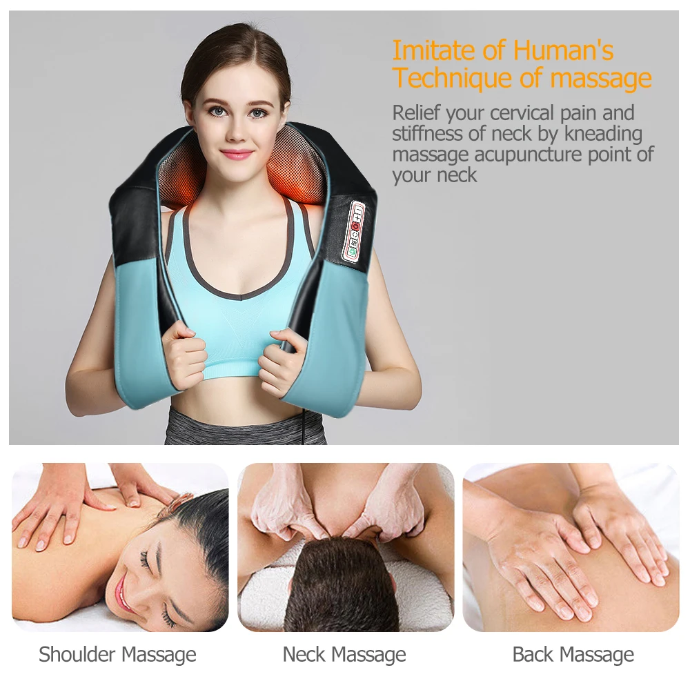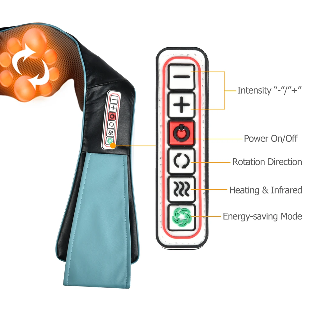 Multifunction Neck Massager Acupuncture Kneading Shoulder Massage Tool Infrared Body Health Care Equipment Car Home Anti Cellulite Features 1.Built-in 2pcs large massage balls and 6pcs small massage balls per side will provide life-simulation kneading and rubbing experience with hands-free operation to effectively relieve chronic suffering, pain and release stress and pressure from neck, shoulder, back, waist, abdomen, leg muscle and etc. 2.Smart heating and infrared function can promote the blood circulation and activate the cells activities to achieve better stimulation effect, and when combined with uniform pressure and constant support, it will easily help you relax and get rid of body fatigue during working or driving. 3.Equips with 6 pressing buttons for individual control experience and custom massaging enjoyment, you can instantly power on/off and directly switch rotation direction, adjust massage intensity and choose heating settings or energy-saving mode according to your demands. 4.Auto power-off function, it will automatically turn off after 15 minutes operation, hassle free without the need to check and monitor the time, carefree to enjoy soothing and relaxing massage, energy efficient and safe. 5.Support both vehicle-mounted and home applications, with the supplied portable carrying bag, you can conveniently access relaxing massage no matter when you are driving a car, taking a nap at home, in your office or even during your travel. 6.Detachable cover and smooth zippers for effortless maintain and enhanced hygiene, and the comfortable PU leather and breathable mesh can deliver skin-friendly touch feelings for all season enjoyment, durable and long lasting. Specifications Material: PU Leather, Mesh Color: Blue & Black(As Picture Shown) Plug Type: US Plug/EU Plug(Optional) Rated Voltage: DC 12V Rated Power: 24W Rated Frequency: 50Hz Massage Heads Quantity: 16Pcs in Total, 8Pcs Per Side Auto Shutoff: Support, After 15 Minutes Operation Size: As Picture Shown Note: Please allow some deviation due to manual measurement and make sure you do not mind before purchase. The color of the actual item may slightly vary from the images due to different computer screens and display settings. Thanks for your understanding!