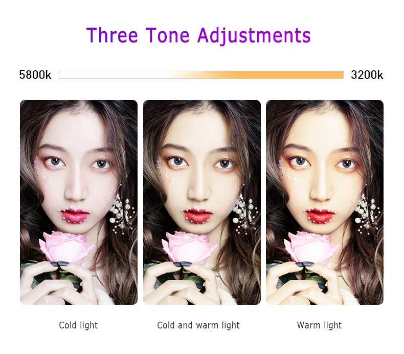 Цветовая температура 3000-5000K, кольцевой светильник с 3 цветными режимами переключения, они белые, теплый желтый, теплый белый.