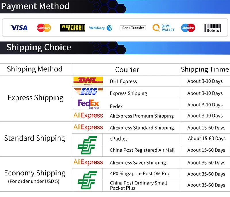 1. О доставке: Обычно может быть отправлен в течение 5 дней, но может быть задержка во время праздников. 2. Номер Отслеживания: Когда вы выбираете способ доставки, он покажет, можно ли его отслеживать обычно. Если вы оплачиваете стоимость доставки, то нет никаких сомнений, что можно отследить. Если нет, то это не обязательно можно отследить весь путь, надеюсь, вы сможете понять. 3. О послепродажном обслуживании: Если есть какие-либо проблемы после получения посылки, пожалуйста, не стесняйтесь связаться с нами в первый раз, спасибо! Поверьте нам, мы дадим вам удовлетворительное решение! :-)