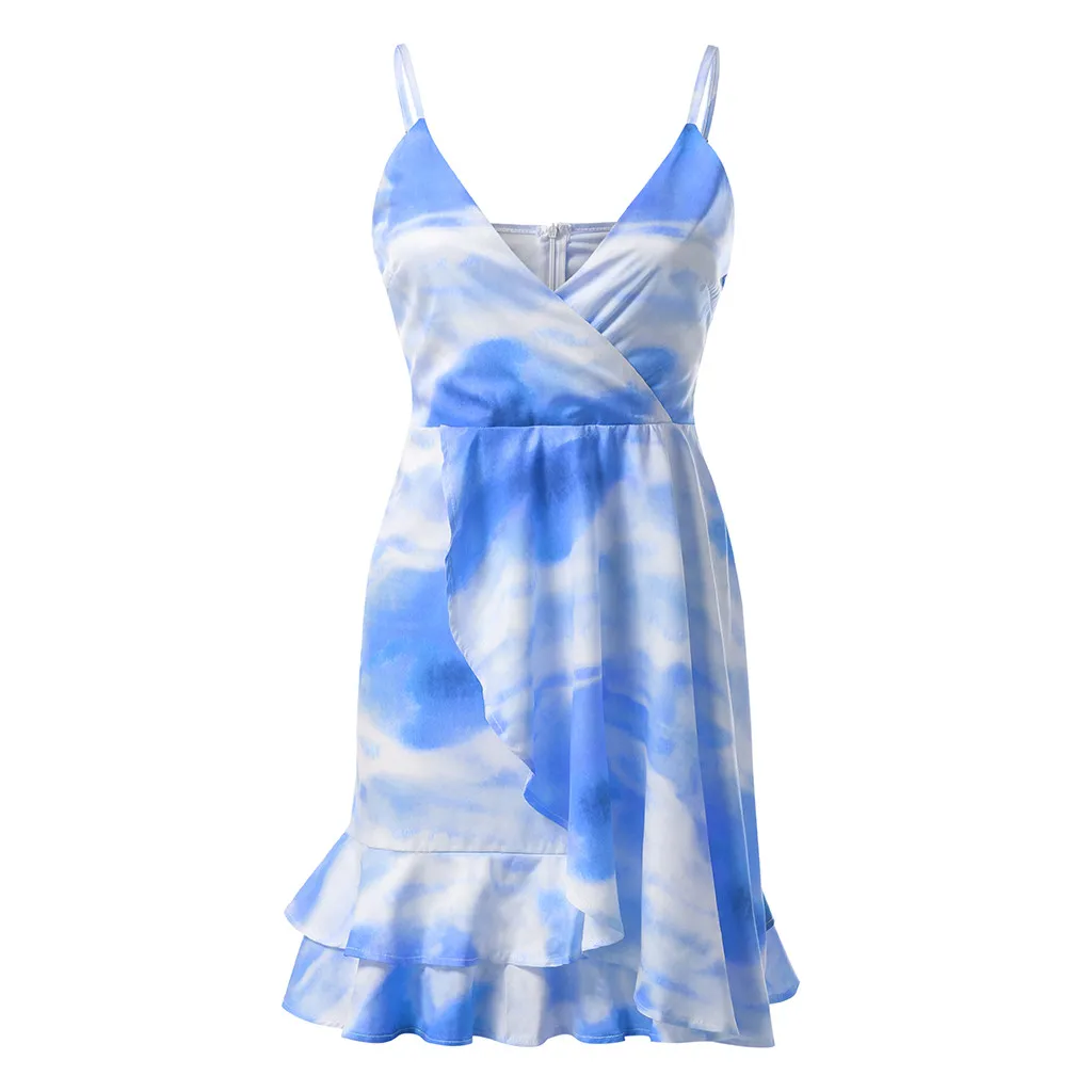 3. Круглый вырез, Без рукавов, с принтом красителя, с рюшами, асимметричный подол, сексуальное летнее платье.Он имеет vОчень лестно обрезается на теле,Покажите свои изгибы с шармом.ATtractive style делает вас очаровательной и сексуальной.