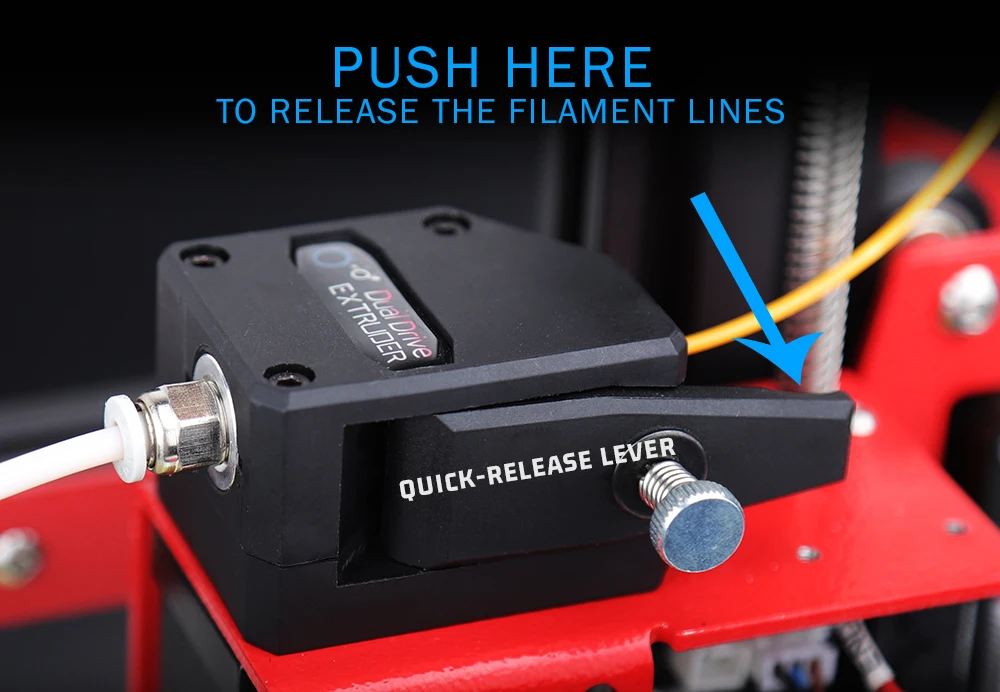 Экструдер разработан с открывающейся ручкой сбоку, которая удерживает одну из двух приводных передач. Эта ручка закрыта пружинным натянутым винтом. Этот миниатюрный винт обеспечивает точное натяжение приводных передач для правильного удержания нити с возможностью освобождения напряжения и просто загрузки или выгрузки нити. Все, что вам нужно сделать, это вытянуть из экструдера, чтобы пружина сжималась достаточно, чтобы выпустить давление на материал, позволяя вам легко кормить его непосредственно в hotend.