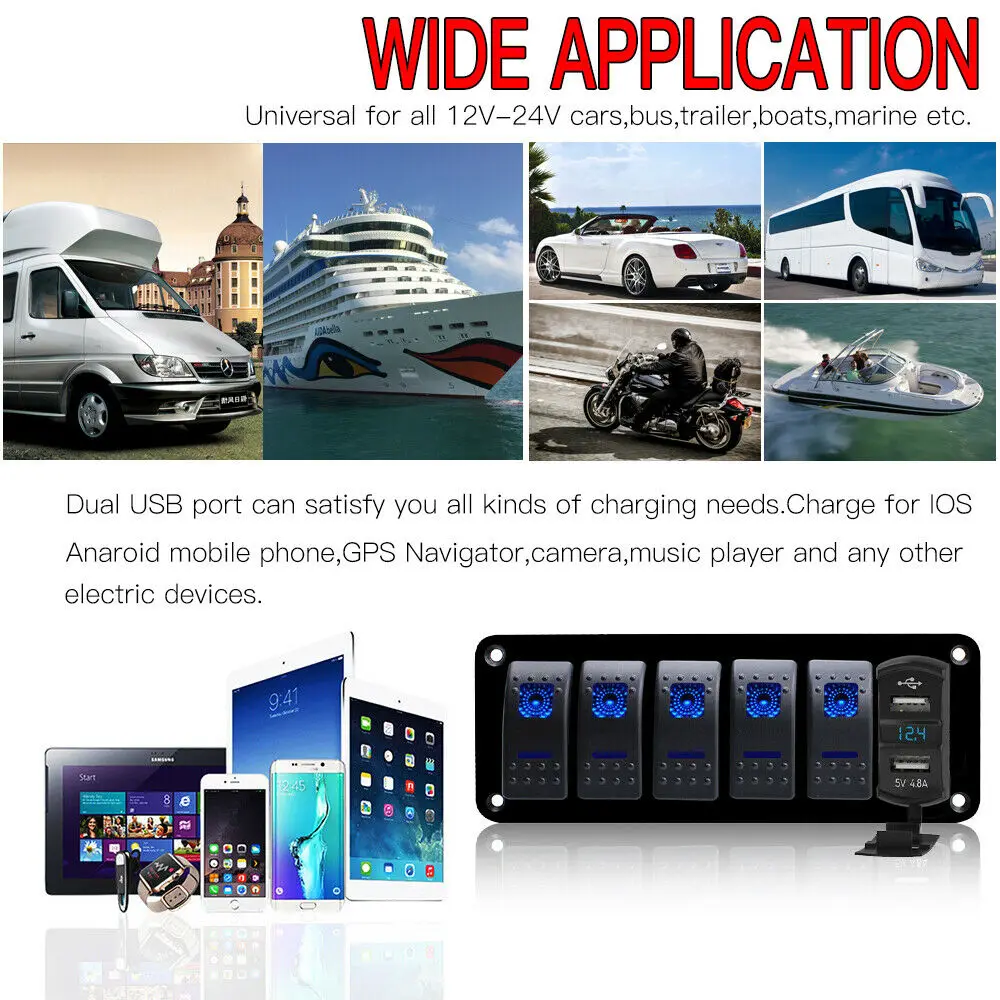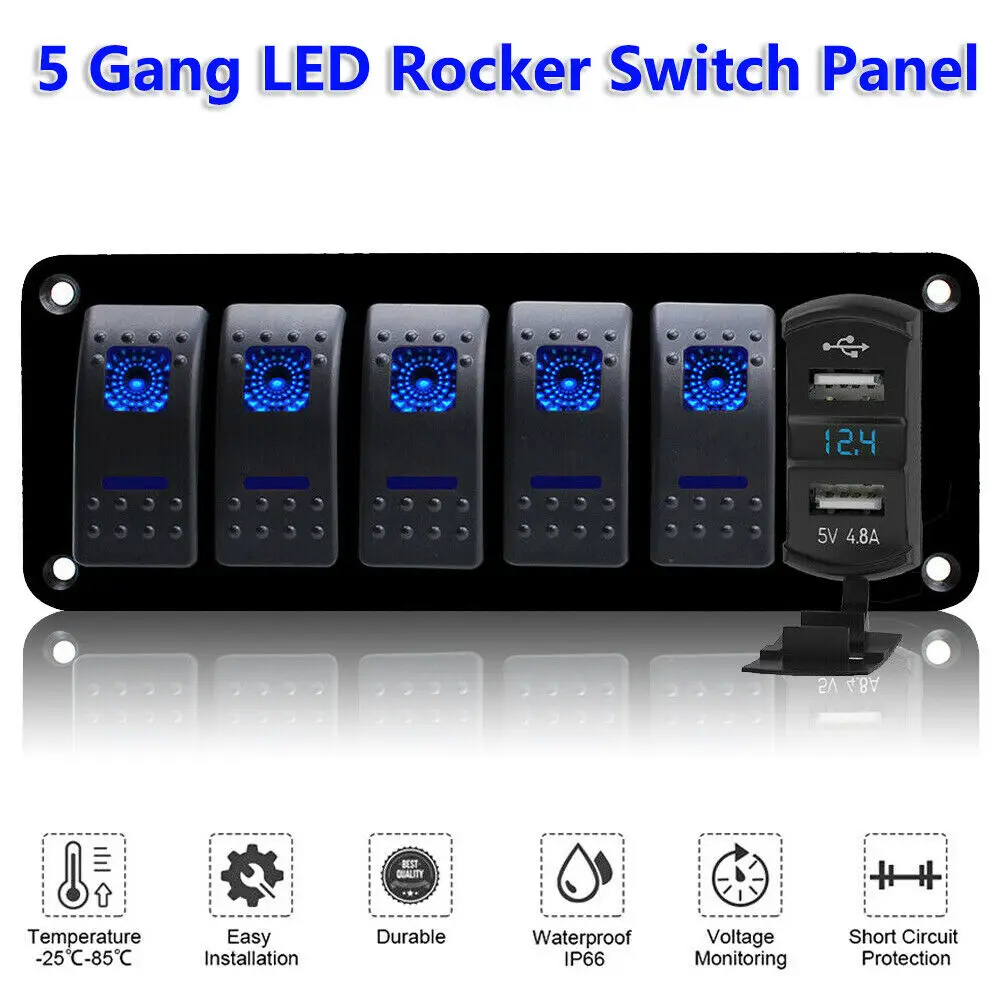 Описание продукта: Многофункциональный комплект панели; Двойное зарядное устройство USB: DC 5В/4,8а; Диапазон дисплея вольтметра: 0 - 30 в; 5 клавишных переключателей. Защита разъема USB: Сертифицировано CE & ROHS с защитой от перегрузки, перегрузки по току и короткого замыкания для обеспечения безопасности зарядки, встроенная защита соединения converse, которая гарантирует, что цепь не будет перегорена При неправильной проводке. 5 кнопок светодиодные Клавишные переключатели поставляются с предохранителем 15А, обеспечивают защиту от перегрузки, перегрузки по току и короткого замыкания; Может контролировать морскую лодку, rv, дом внутри светодиодных фонарей и другой электронной системы 12 В. Широкое применение: конструкция для многофункциональных требований, подходит для систем 12 В/24 В, широко используется для автомобилей, лодок, жилых автофургонов, грузовиков, квадроциклов, UTV, кемперов, фургон и многое другое. Легко устанавливается, может быть установлен горизонтально или вертикально (по желанию горизонтально) Спецификация: Многофункциональная Панель Цвет: синий светильник Материал: сверхпрочная алюминиевая лицевая панель Напряжение: 12 В-24 В Выход USB-порта: 5 В постоянного тока/4,8 А (2,4 A + 2,4 A) Диапазон отображения вольтметра: 0 - 30 в Защита от перегрузки: 12 В-24 В, 15 А постоянного тока Рабочая температура: от-25 до 80 градусов Посылка входит: 1 x Панель переключателей 4 x винта из нержавеющей стали 132 шт. x наклейка на тумблер с ночным свечением