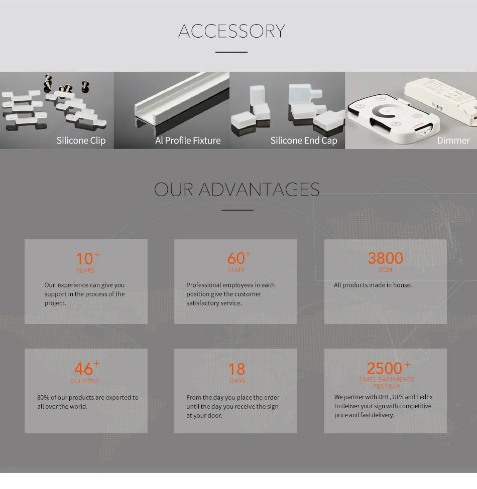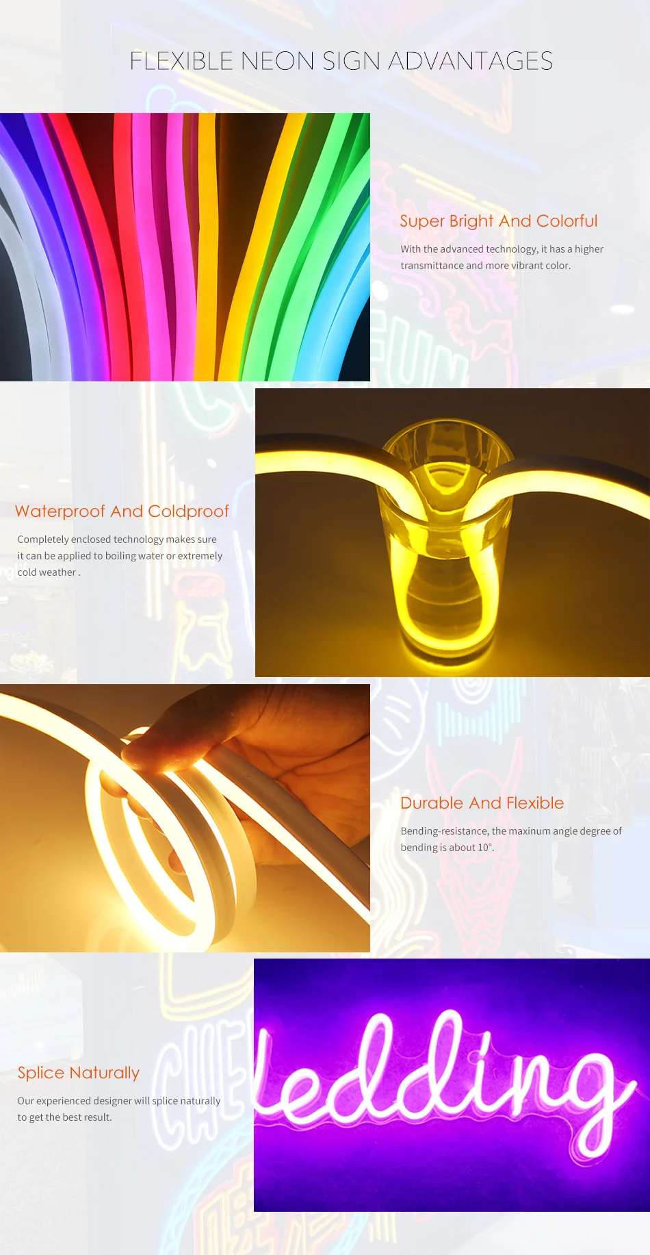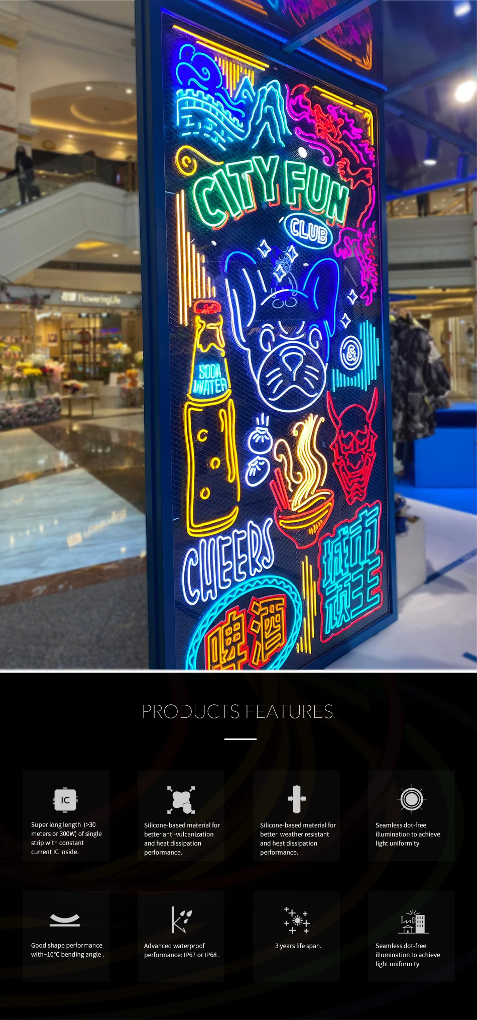 Светодиодный гибкий неоновый, изготовлена из пластичного полимера, которые могут передавать светильник и достаточно гибкой, чтобы объединить много органических светильник ing приложений. Светодиодный Flex Neon состоит из светодиодный s внутри ПВХ защитный корпус. Эта форма позволяет для даже распределения светильник и производит последовательную светильник эффект, схожий с термопластичным каучуком, традиционные стеклянные неоновые светильники.