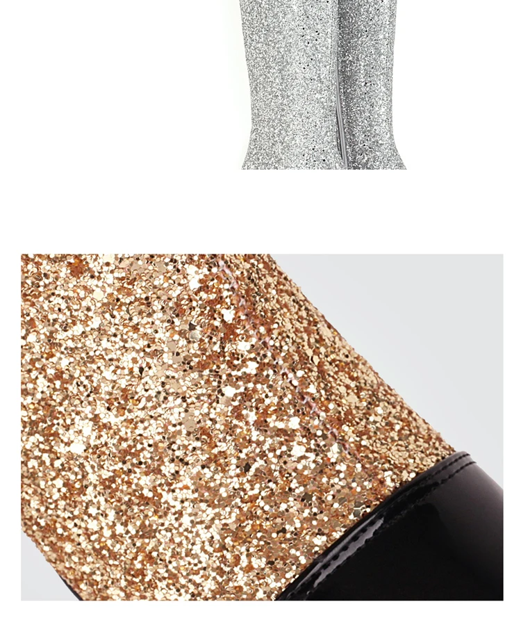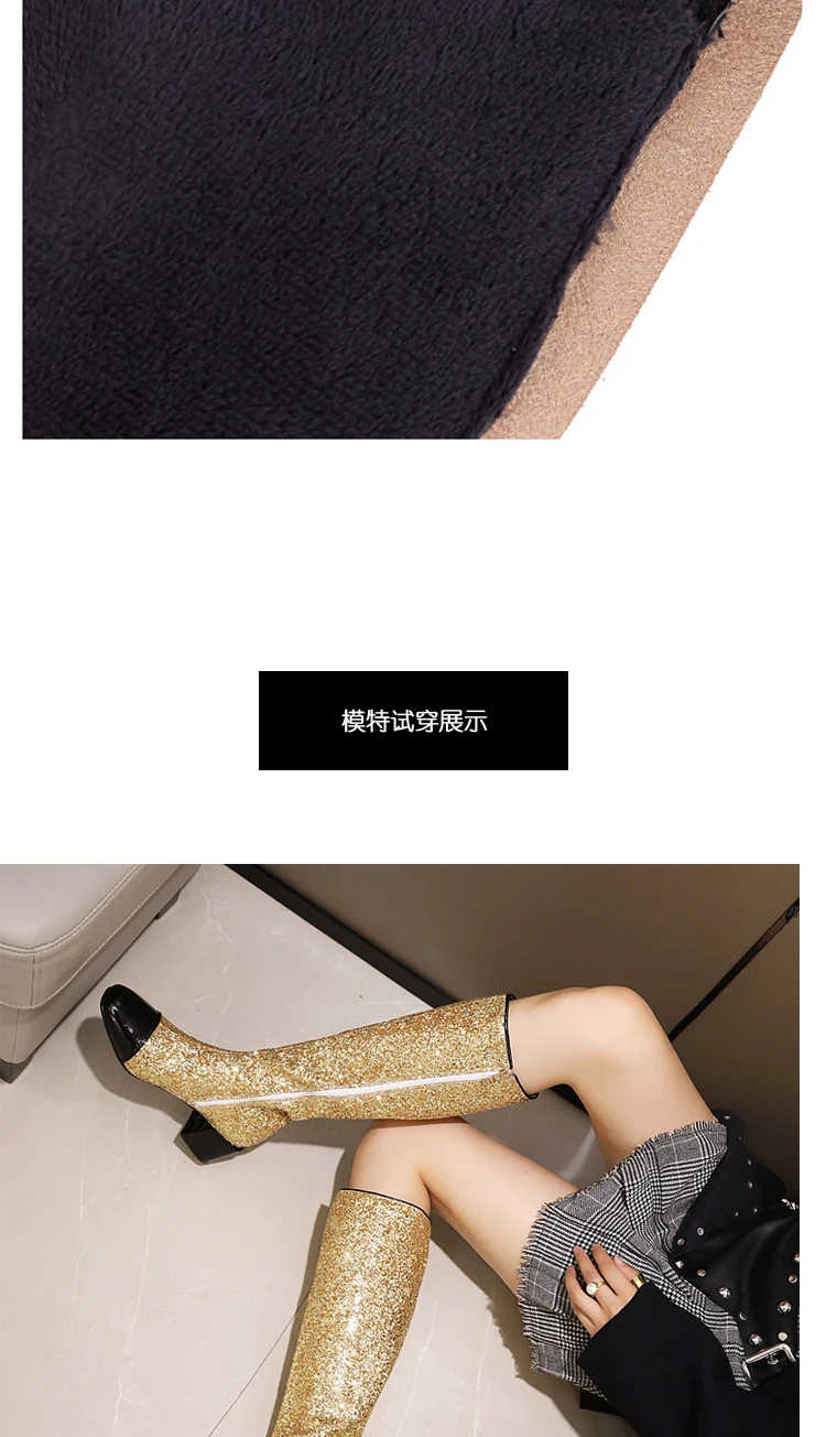 Блестящие сапоги до колена из лакированной кожи; Блестящие женские сапоги с блестками на толстом каблуке с квадратным носком; Зимняя короткая плюшевая обувь