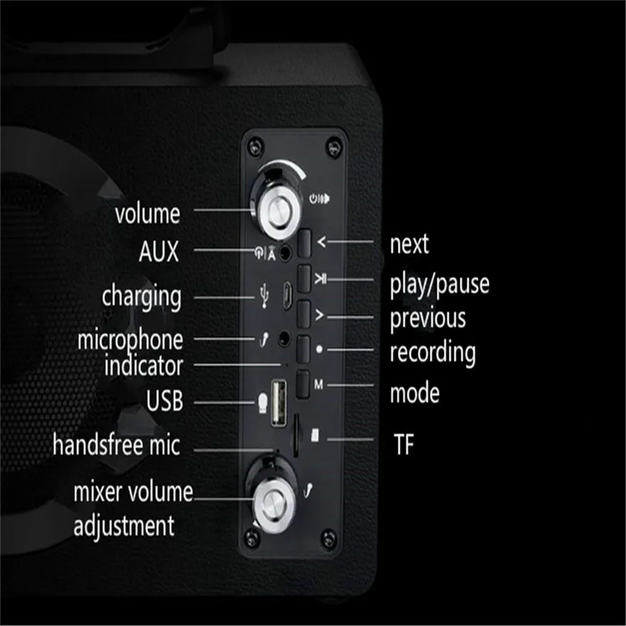 1. Древесины, предельная Синусоидальная мощность: 20 Вт (4 дюймовый динамик), поддержка bluetooth громкой связью/FM-радио/Aux/TF/USB 2. Совместим с функцией караоке, беспроводной или проводной микрофон (не прилагаются) 1 ключ записи, повторите, голосовые подсказки 3. Встроенный 1500 мАч аккумулятор, 8 часов воспроизведения 4. Размер: 22x8x15 см, вес: 0.9kgs 5. Цвет: черный/в стиле «граффити»