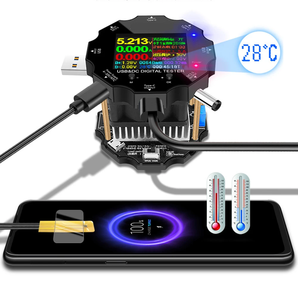Функции: переворачивание экрана, хранение данных, обнаружение мощности и емкости, измерение температуры, быстрая зарядка, широкое напряжение, измерение старения разряда и т. д. (датчик температуры не входит в комплект).