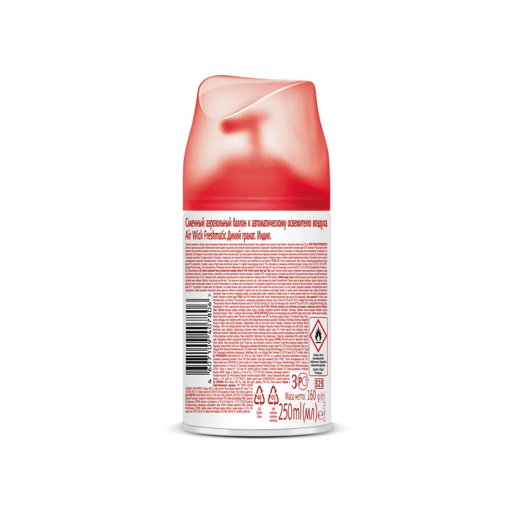 Применение: Используйте только с диспенсером Air Wick Freshmatic. Перед тем, как вставить аэрозоль, проверьте, что диспенсер выключен. Не направляйте в лицо при включении или при установке интервала распыления.