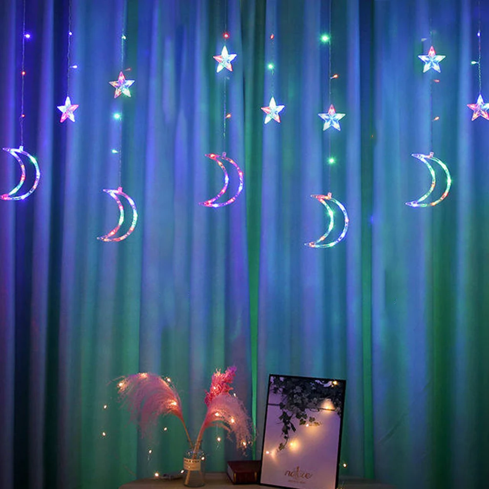 Светодиодный Шторы строка светильник с изображением луны и звезд, флэш-фея теплый белый многоцветная Лампа типа штепсельных вилок декоративный ночной Светильник для дома окно Рождественский Декор