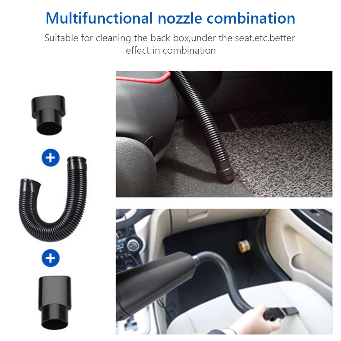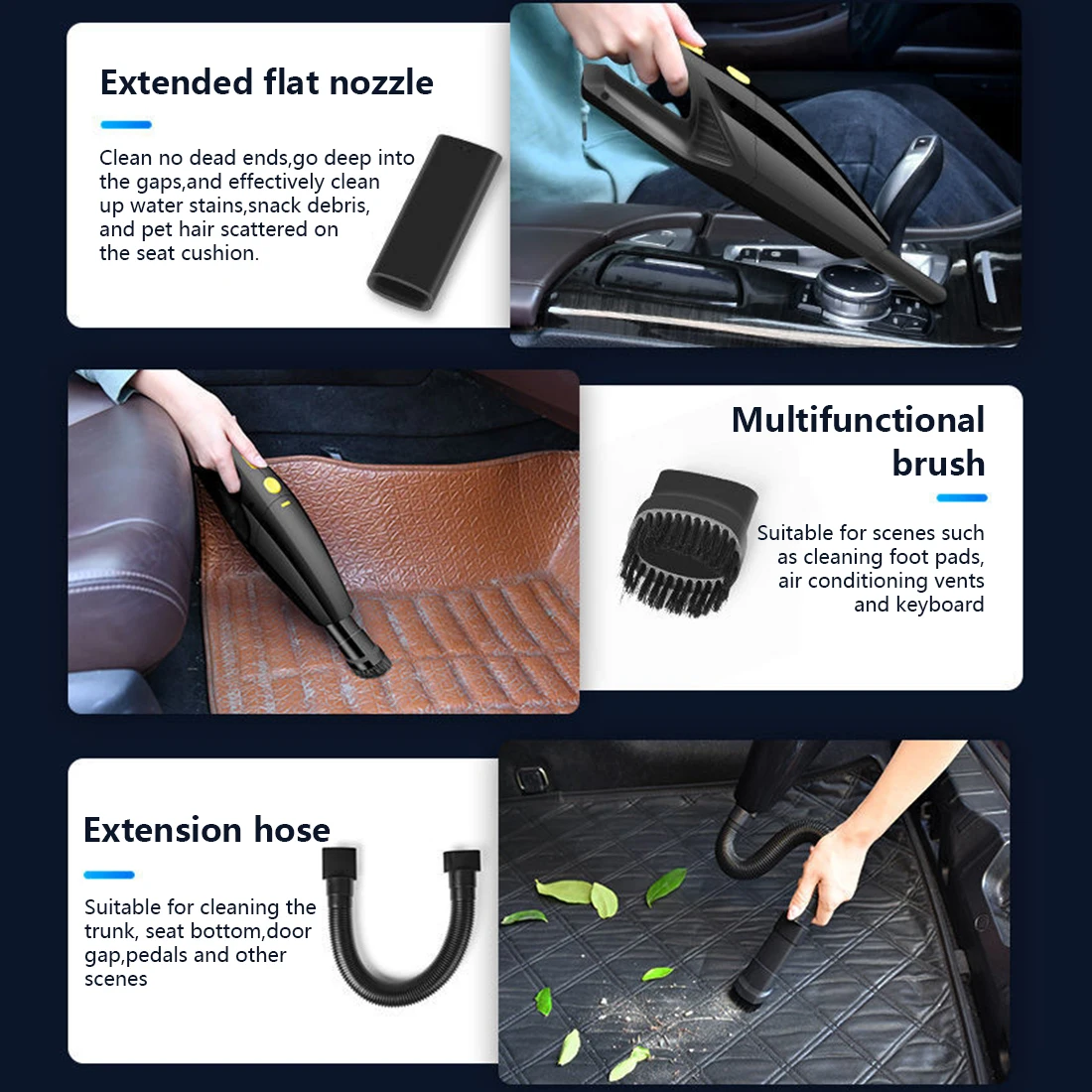 Полные аксессуары: оснащены пятью различными насадками, которые могут обрабатывать различные места. Содержит головку щетки, шланг EVA, щелевой наконечник, длинный наконечник, короткий наконечник, чтобы помочь подключить аксессуары. Щелевой наконечник используется для узких прорезей, углов и жидкостей. Головка щетки используется для очистки волос на ковре или кровати. И шланги могут помочь достичь углов и высоких мест. Вне зависимости от дома, офиса или автомобиля, вы можете легко очистить любой уголок.