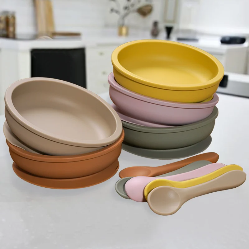 Одноцветная детская посуда, набор, портативная детская силиконовая тарелка, миска для кормления малышей, присоска для младенцев, посуда с силикагелем, ложка