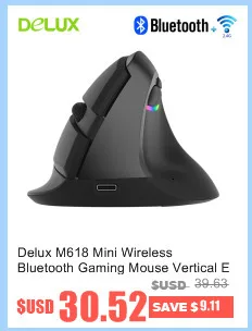 Product description: The Delux M618 wireless vertical mouse, adopts an ergonomic design, providing comfort for the user's palm and wrist. The texture on the main body and palm rest has the function of antiskid. The mouse includes six function buttons (Left Click / Right Click / scroll wheel / Forward / Backward / DPI Button) Features: