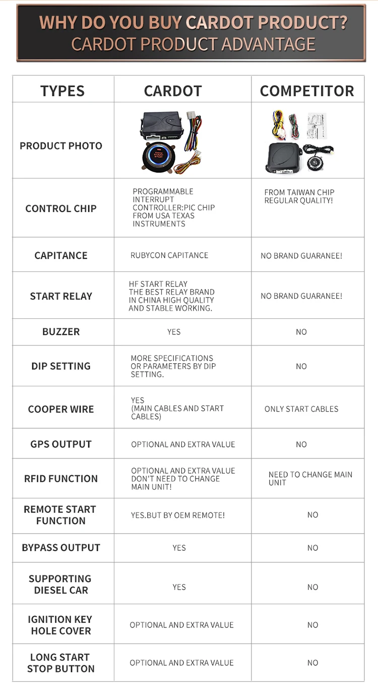 Советы: подходит для холодной погоды в России и УкраинеФункция:CARDOT 1000PSR-это обновленная версия RFID и система push start stop, она в основном работает с дистанционным безключевым входом, удаленным центральным замком, автомобильной сигнализацией без функций запуска. Она имеет10 функций:1. Добавить кнопку Пуск остановки автомобиля2. Не нужно менять пульт дистанционного управления, Используйте оригинальный пульт дистанционного управления, чтобы запустить остановку вашего автомобиля3. Поддержка бензинового автомобиля, дизельного автомобиля, lpg автомобиля. Дизельный режим имеет 6 секунд Время прогрева, независимо от того, насколько холодно ваше место, вы можете начать автомобиля4. 0,85 во-вторых и 1,2 секунд время запуска может быть выбран, просто переверните dip4 переключатель, который нужно выбрать5. Можно сохранить исходный режим запуска ключа автомобиля, отрегулируйте dip5, чтобы выбрать Запуск ключа или нажмите кнопку запуска, чтобы начать6. Можно добавить gps-модуль или модуль bluetooth для управления приложением7. Если оригинальный автомобиль должен избегать чипа, вы можете добавить байпасный модуль, чтобы избежать иммобилайзера8. Rfid-метка активирует кнопку Пуск, перед запуском автомобиля необходимо использовать метку для снятия кнопки.9. Автоматическое отключение 90s Кнопка Пуск, когда кнопка Пуск разблокирована, и никаких действий в течение 90 с, кнопка Пуск отключится, необходимо использовать тег, чтобы разблокировать кнопку10. Rfid-метка Может программировать 10 шт.Преимущества:1. Если вы хотите иметь только функции RFID и push start stop, вы подключаете только 6P start кабели, не нужно подключать основные кабели.2. Если вы не можете найти провод топливного пути, вы можете отключить Подключение провода топливного пути путем настройки погружения;3. Микрочип и фирменное реле гарантируют высокое качество и долгий срок службы;4.100% медных проводов;5. Приветствуем сотрудничество с агентом и принимаем заказы OEM или ODM;6. Работа с оригинальным автомобильным дистанционным центральным замком или послепродажной автомобильной сигнализацией.7. Вы можете выбрать gps модуль из cardot, вы можете использовать мобильное приложение для управления автомобилем!Описание товара